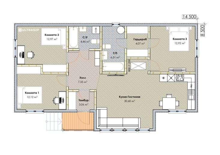 Три комнаты достаточной площади, санузел, гардероб, техпомещение и Г-образная кухня-гостиная площадью 30м2. сделают жизнь в этом доме комфортной и уютной для молодой семьи..