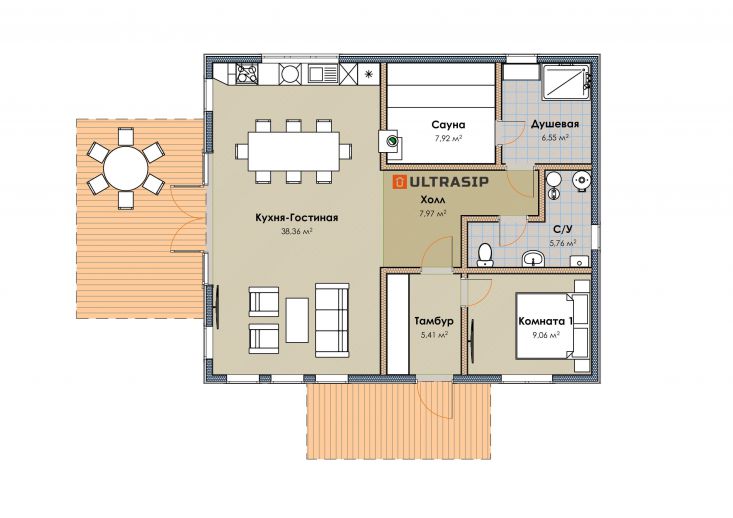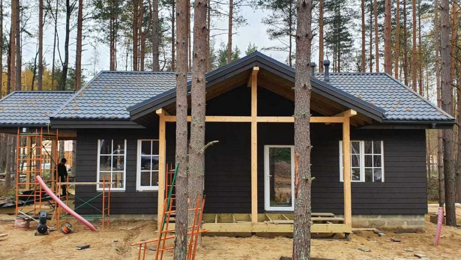 В Токсово, что под Санкт-Петербургом, мы построили баню с продуманным и оптимальным набором помещений: 1 спалня, санузел, душевая, сауна и громадная кухня-гостиная площадью 39 м2. Предусмотрена выходящая на запад терраса площадью 20м2.