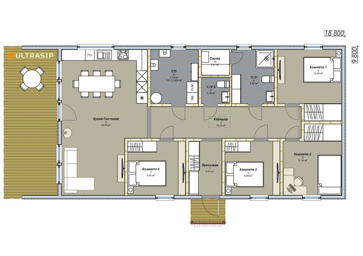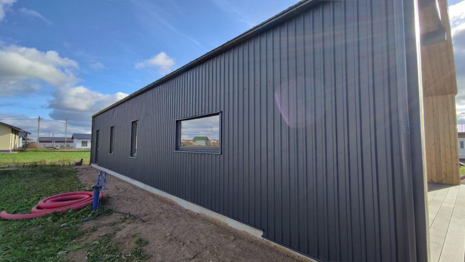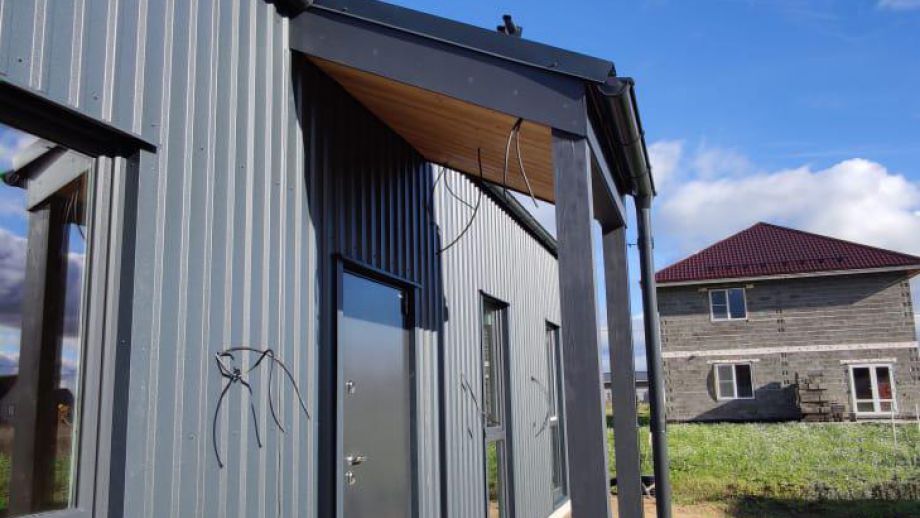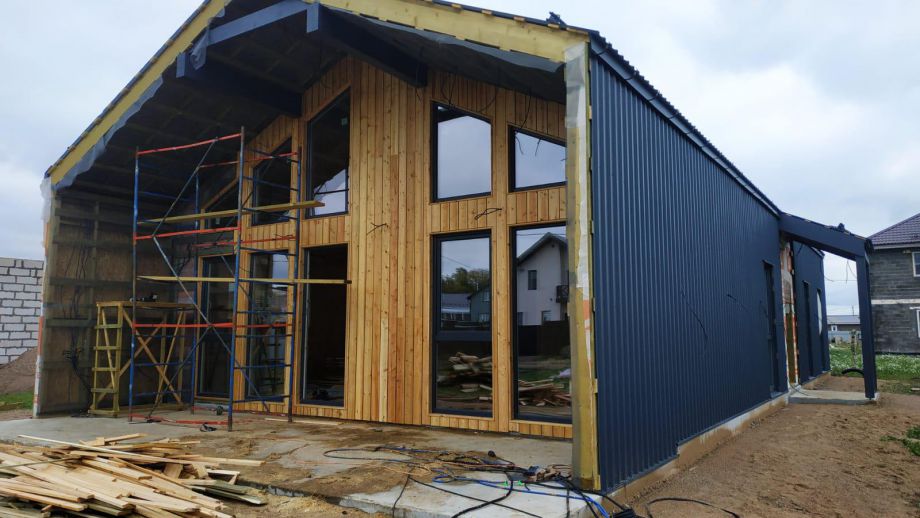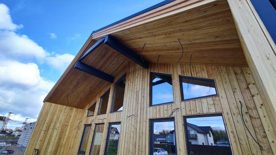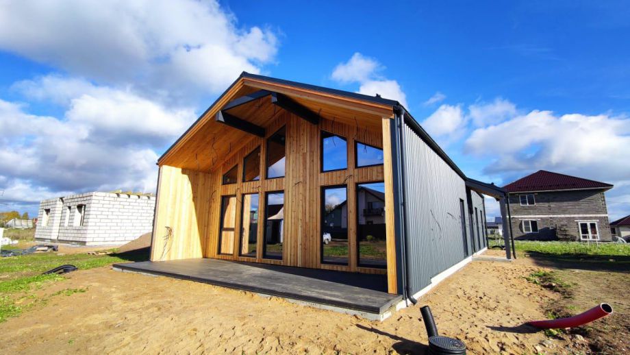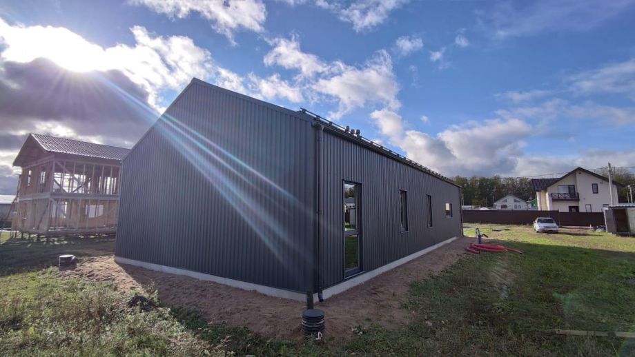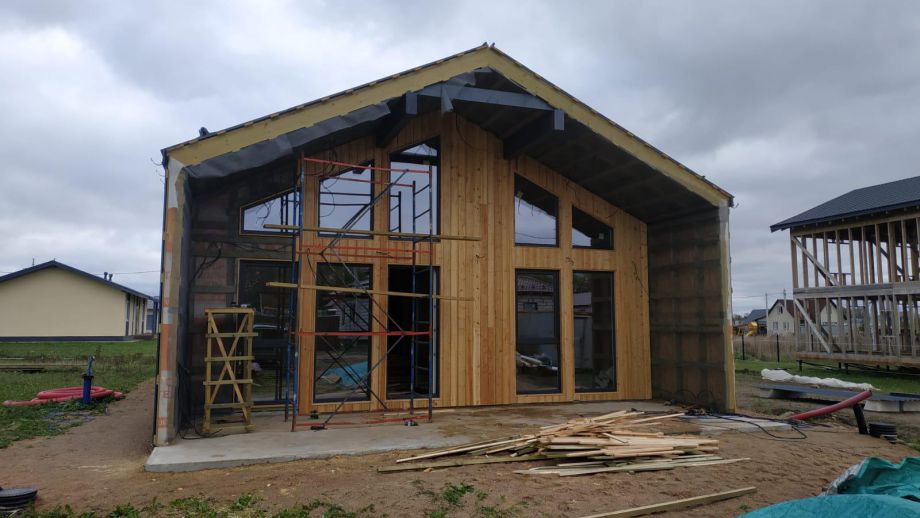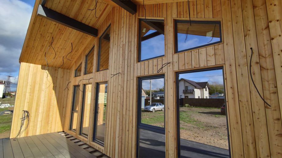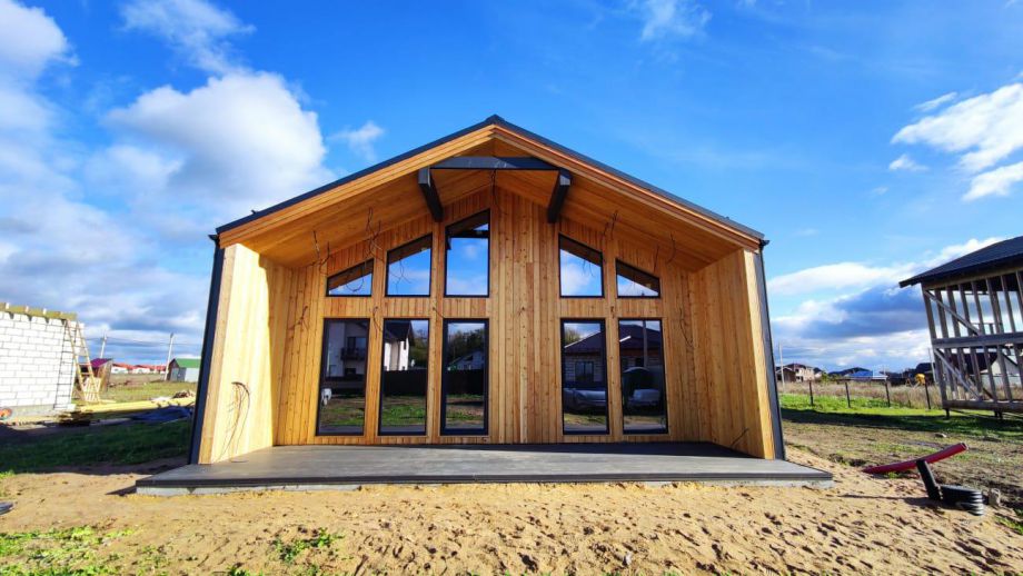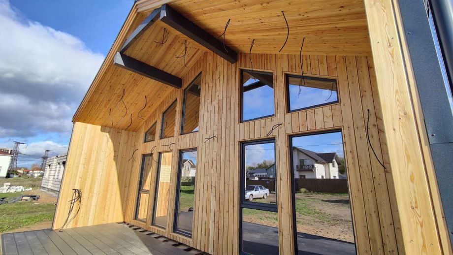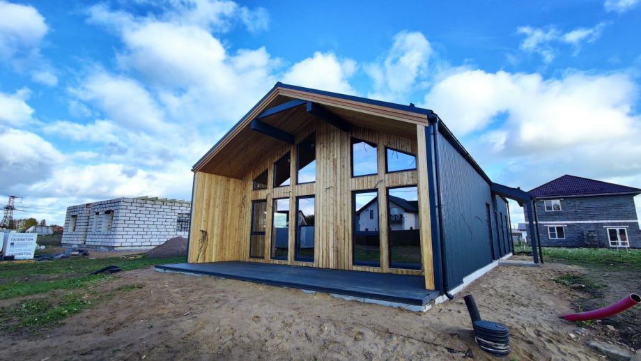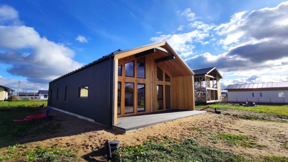 Мы построили этот продуманный и эффектный барнхаус по индивидуальному проекту в ближайшем пригороде Санкт-Петербурга - п. Тайцы. Предусмотрено все, что нужно для комфортной жизни - кухня-гостиная со вторым светом и панорамным остеклением площадью 34м2., большая удобная терраса, два санузла, техпомещение "под газ" и четыре спальни. Дом вписан участок, учтены все пожелания заказчиков - вид из окон, расположение заезда, наличие шумных соседей и трасс по соседству и еще множество нюансов.