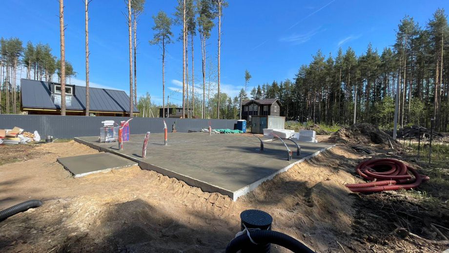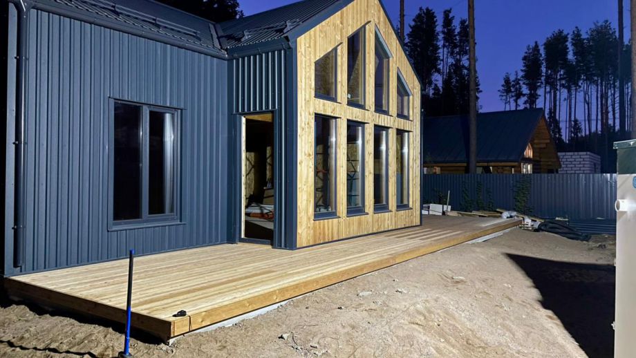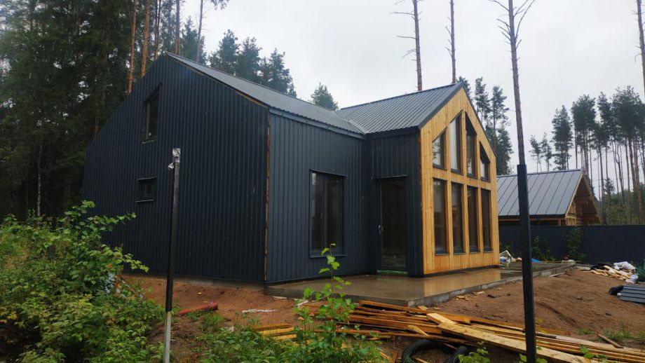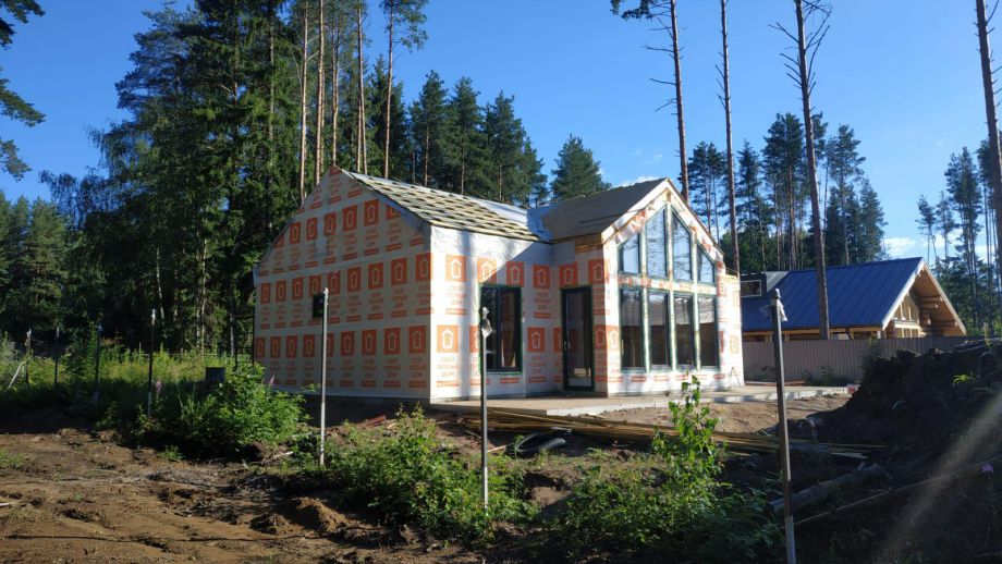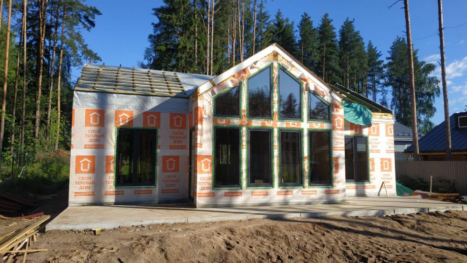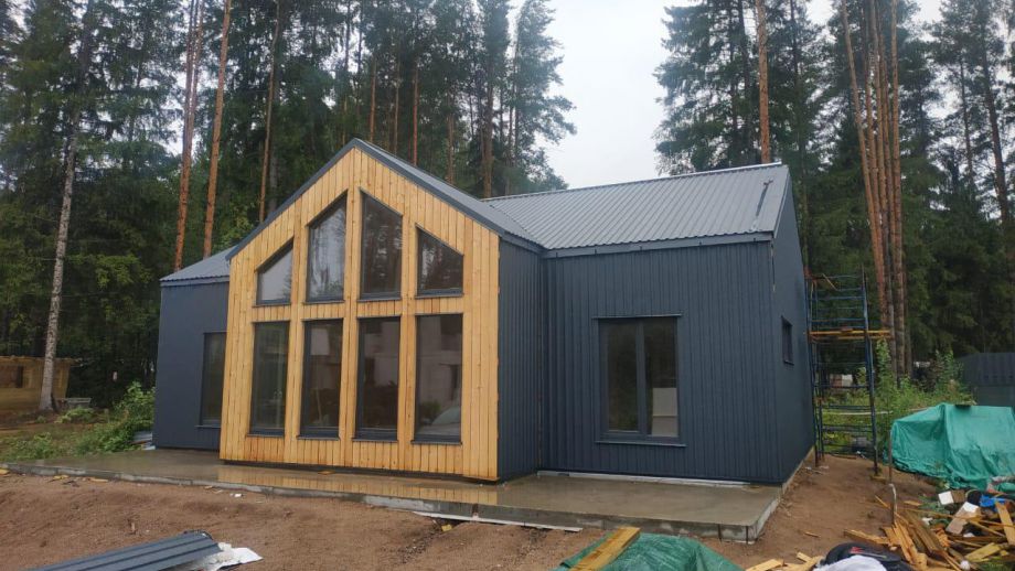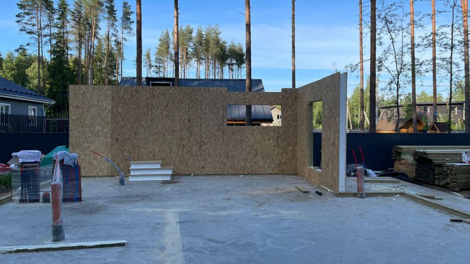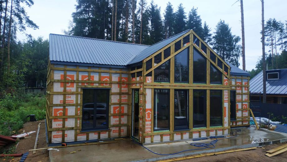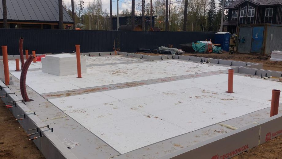 Фундамент дома - УШП, Утепленная Шведская Плита, смонтирован нами заблаговременно. В указанную цену входит УШП и дом в комплектации Оптимум - это закрытый теплый контур с фасадом, окнами, входной дверью, вентпакетом УЛЬТРАВЕНТ, системами снегозадержания и водостока, террасой, без внутренней отделки.