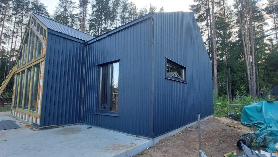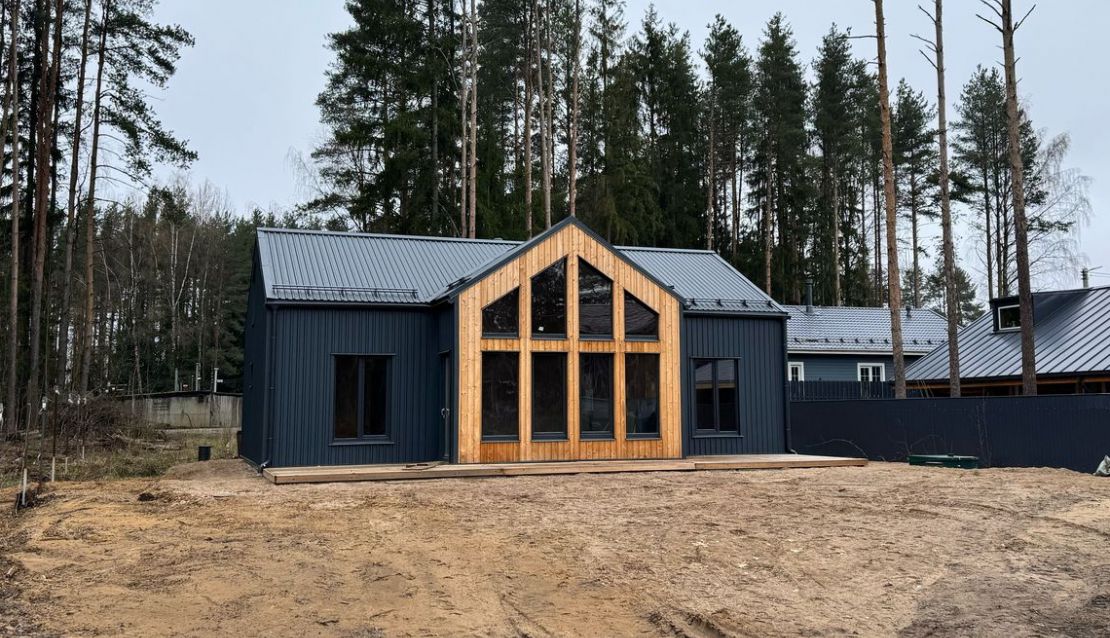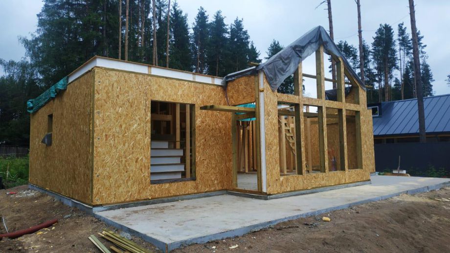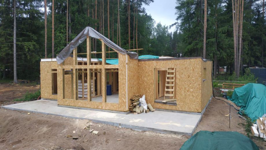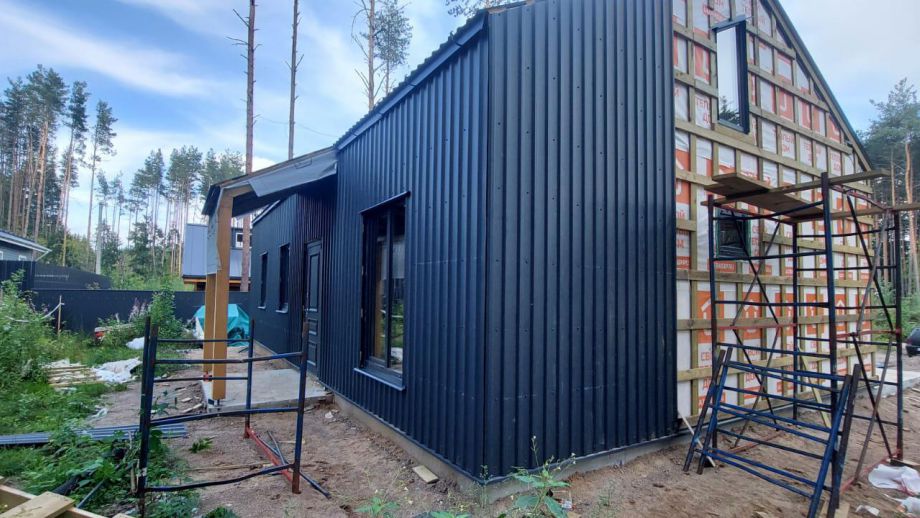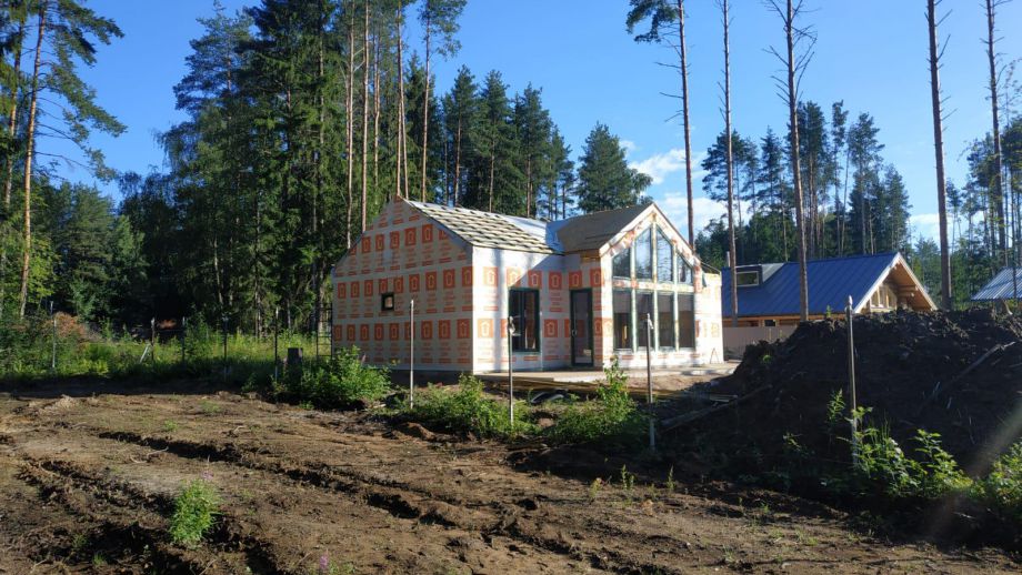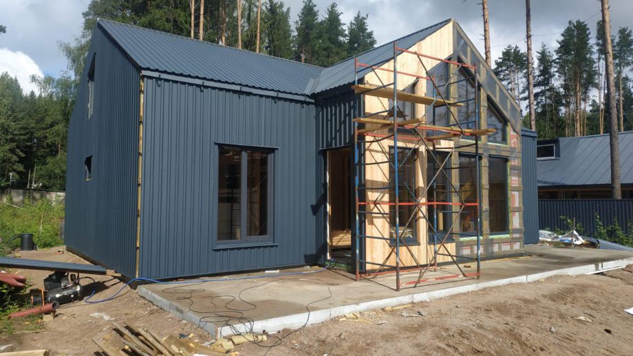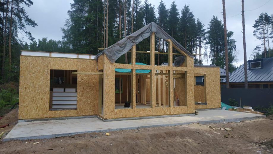 Фундамент дома - УШП, Утепленная Шведская Плита, смонтирован нами заблаговременно. В указанную цену входит УШП и дом в комплектации Оптимум - это закрытый теплый контур с фасадом, окнами, входной дверью, вентпакетом УЛЬТРАВЕНТ, системами снегозадержания и водостока, террасой, без внутренней отделки.
