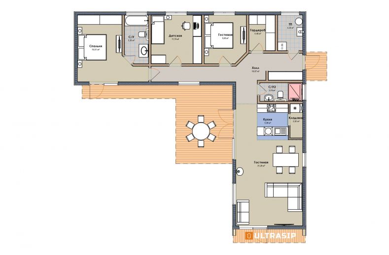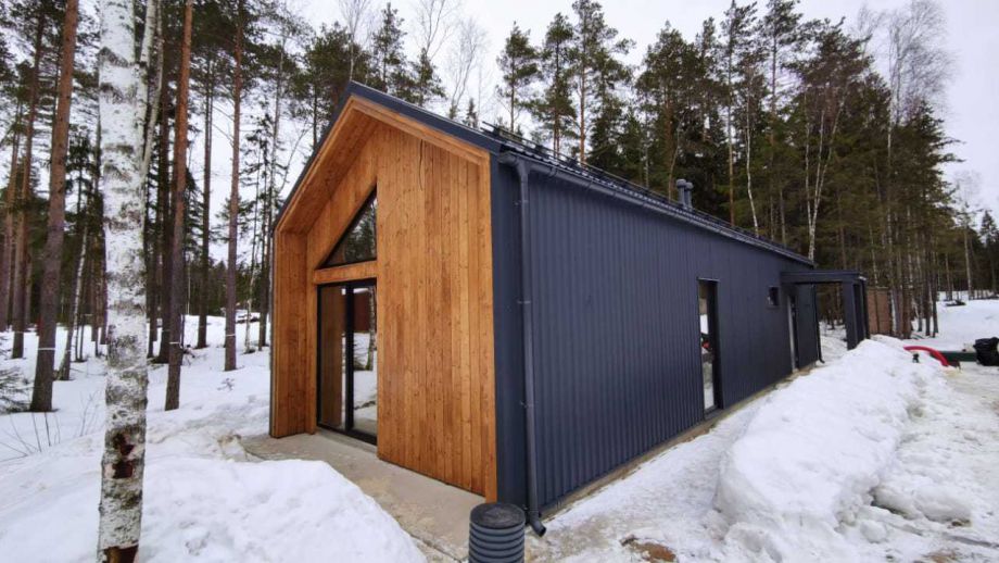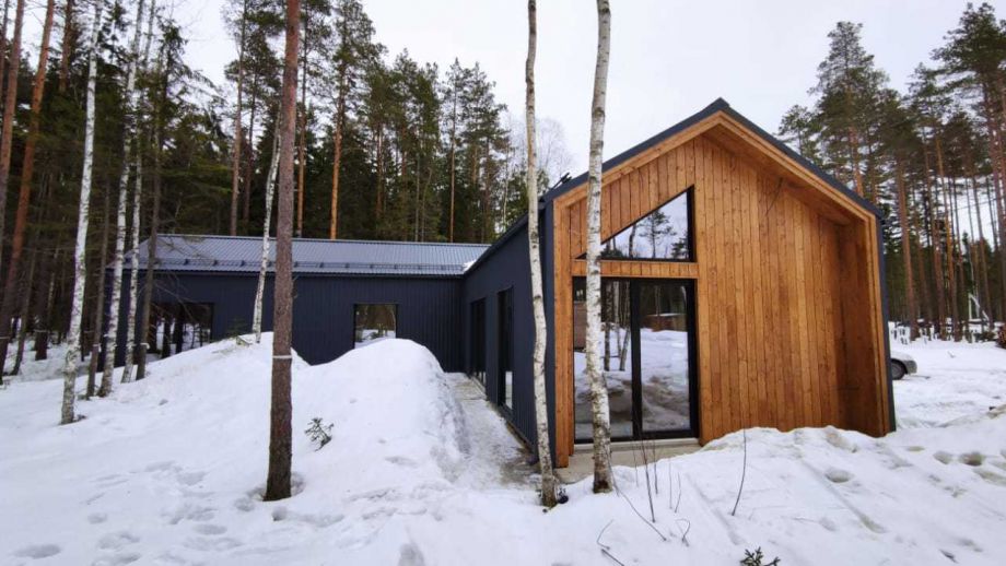 Красивый и оригинальный Г-образный дом в трендовом сейчас стиле Барнхауз, или Барн ( Barn) мы построили в Белоострове, что под СПб. В нем есть все, что нужно для загородной жизни - кухня-гостиная со "вторым светом" и площадью 36м2., уютная терраса во внутреннем дворике, два санузла, кладовая, гардероб и три уютных комнаты.