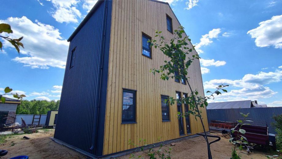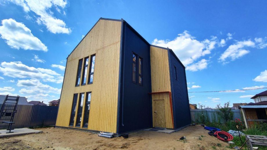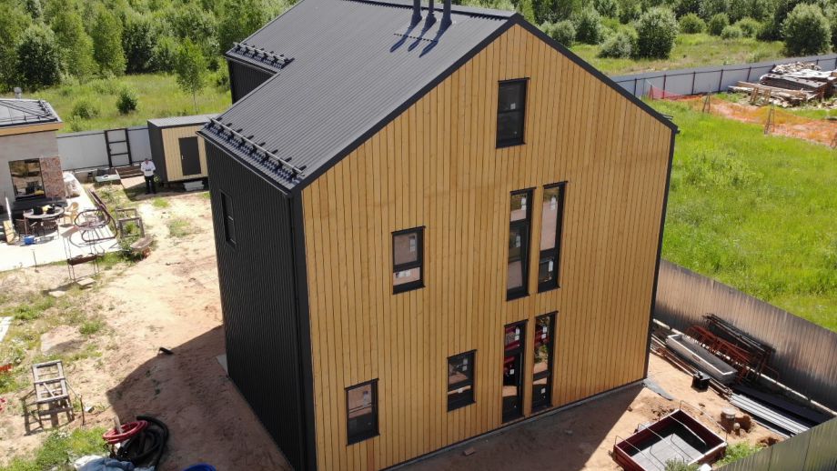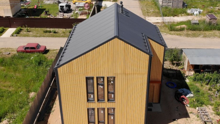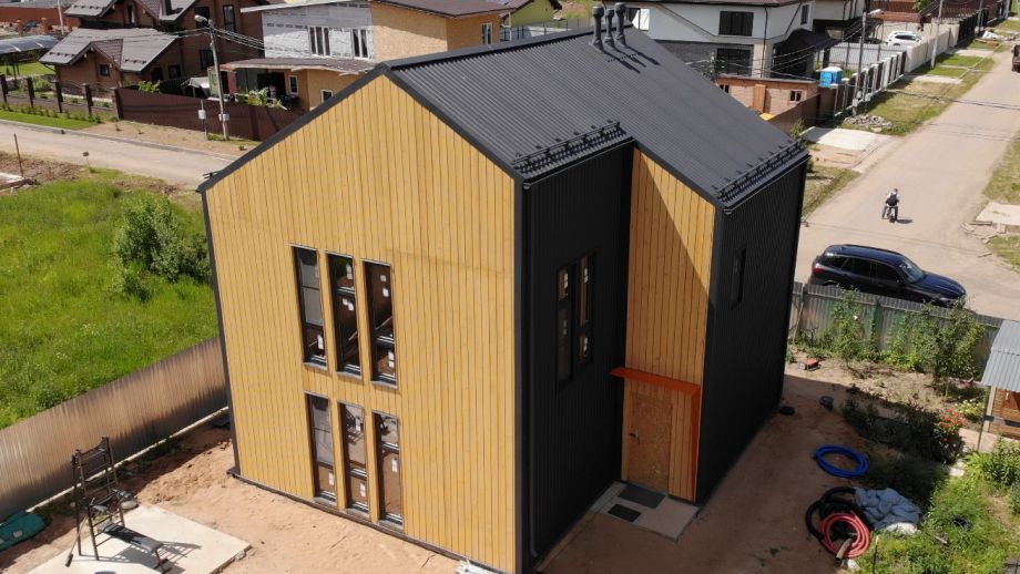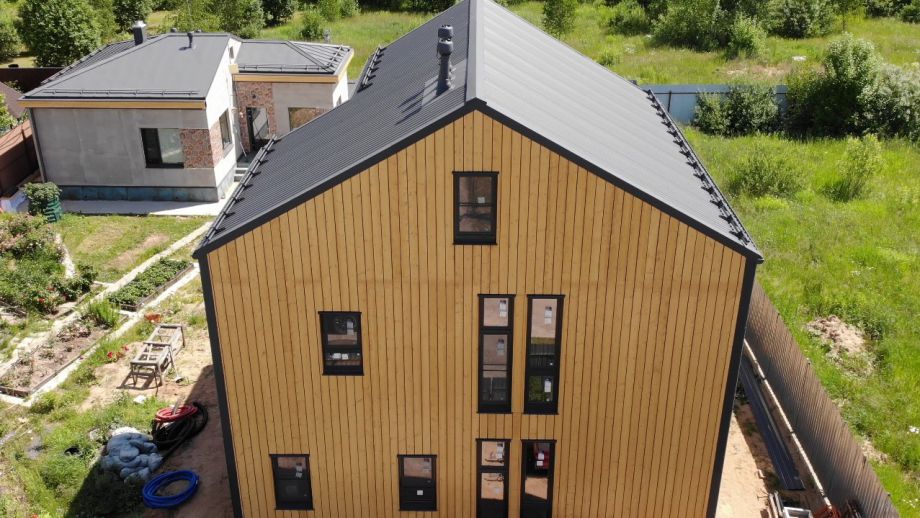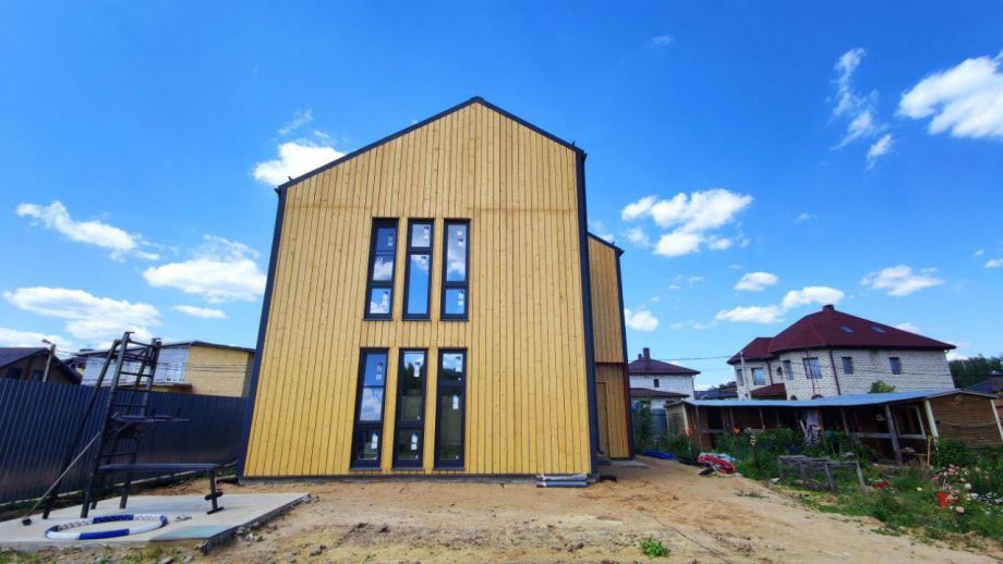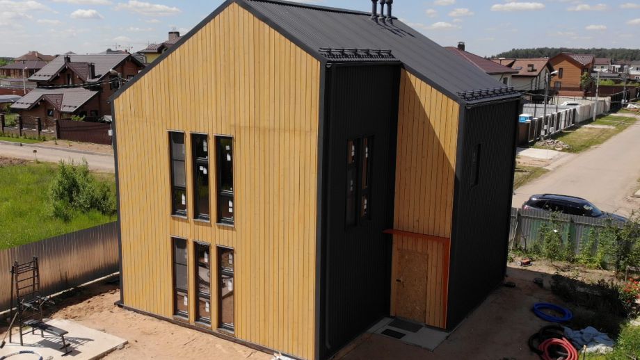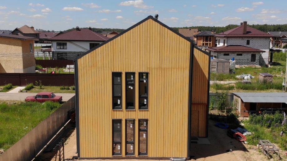 Необычный барнхаус на УШП мы построили в пригороде Москвы, деревне Рогозинино. Это дом с уникально теплым конструктивом - толщина панелей перекрытия - 324мм. с утеплением 300мм. ППС (!), вот подробная статья об этих панелях. В стенах применены панели толщиной 224мм. Такой конструктив получил собственное название Оймякон-ULTRA. В России на сегодня построено 6 таких домов, все они построены компанией ULTRASIP.