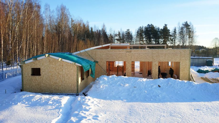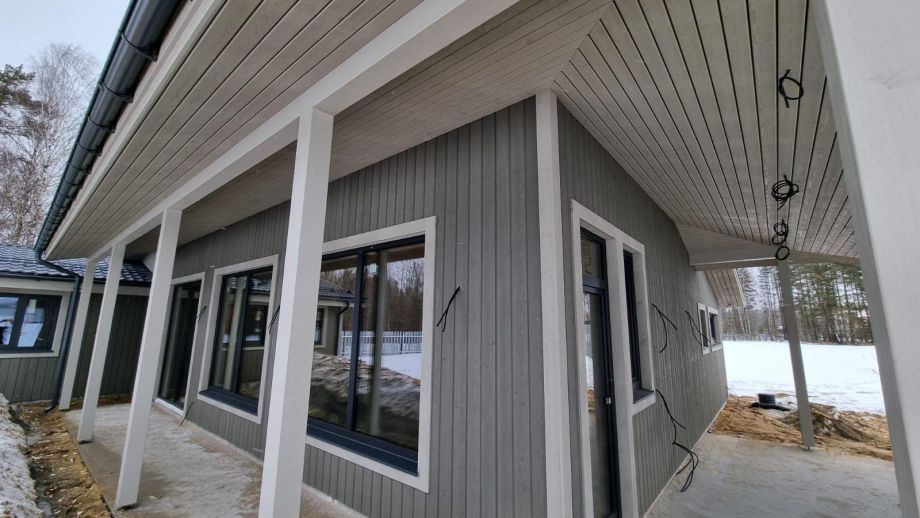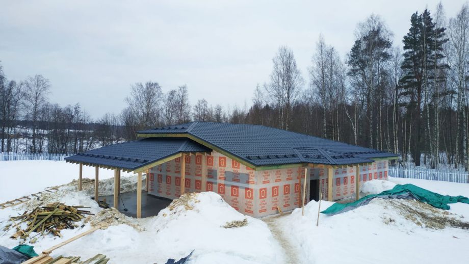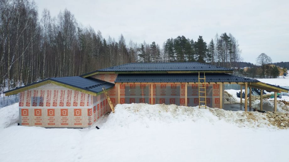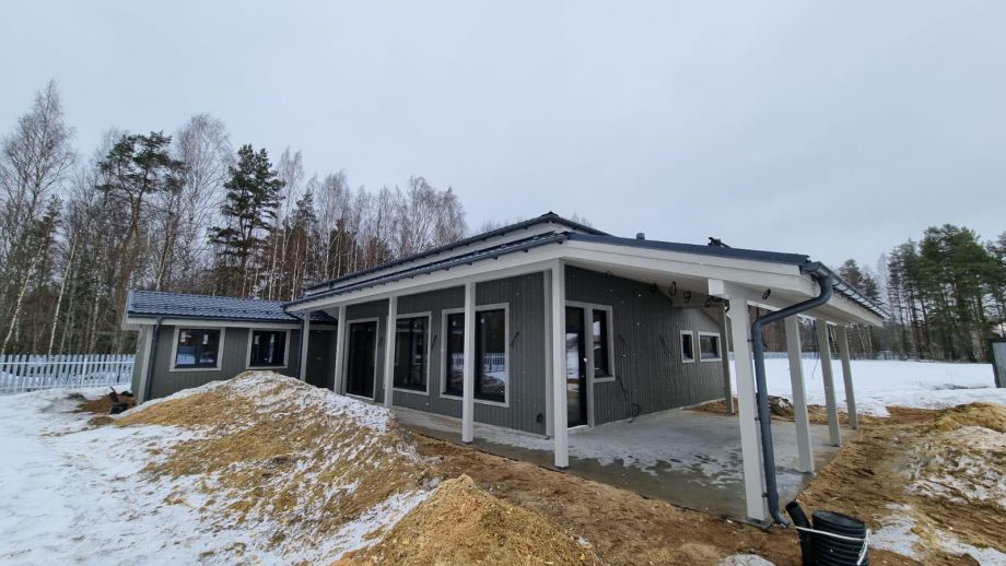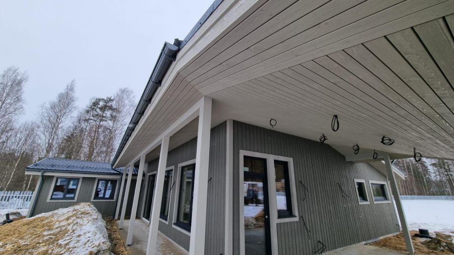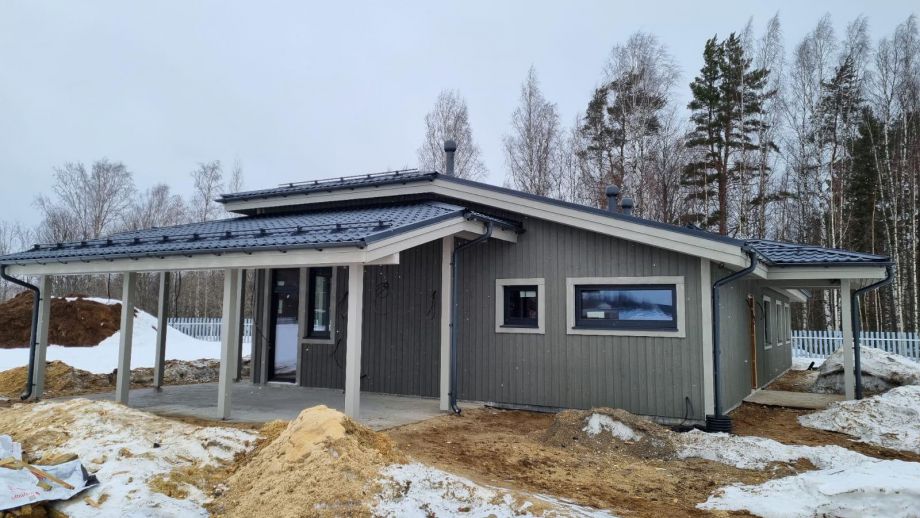 В клубном коттеджном поселке Сувантоярви, что под Санкт-Петербургом, мы построили интересный и объемный одноэтажный дом с потолками высотой 5м. и исчерпывающим количеством подсобных помещений - здесь 2 санузла, сауна, два гардероба, два техпомещения и своя купель.