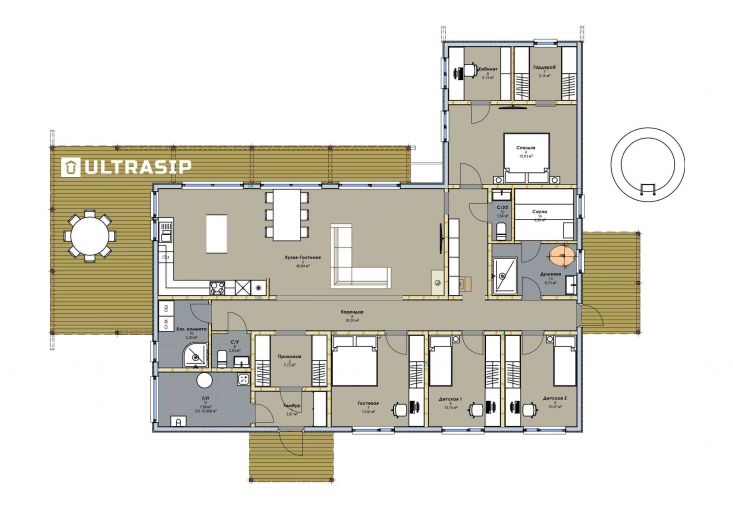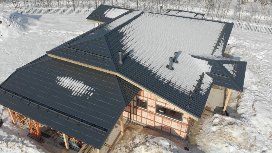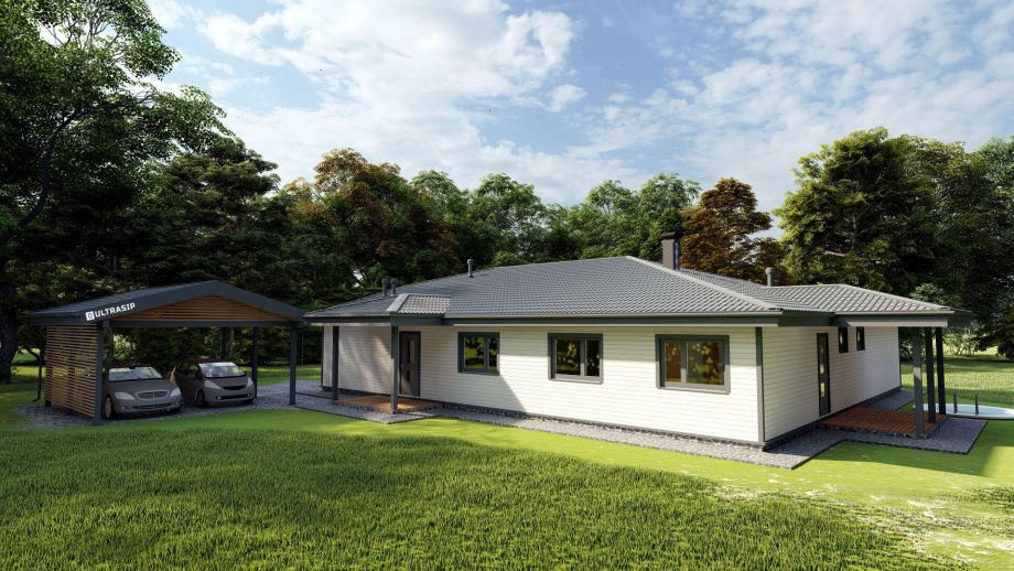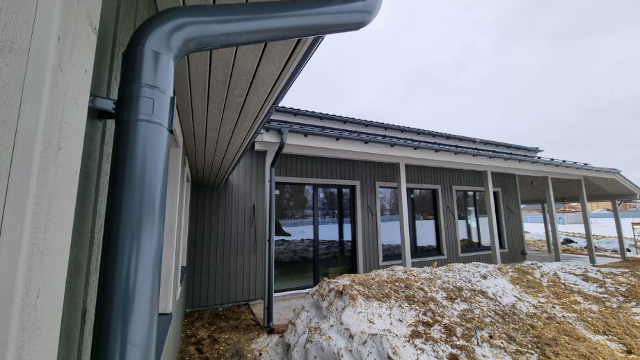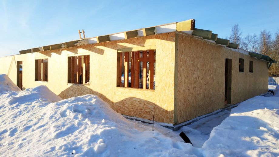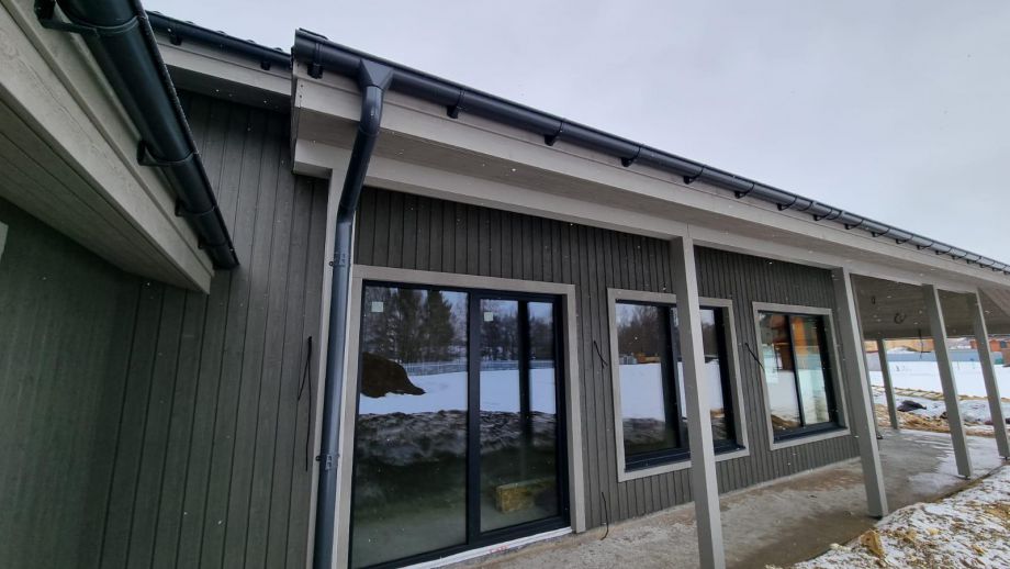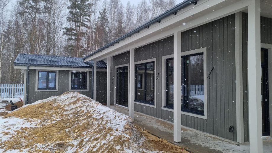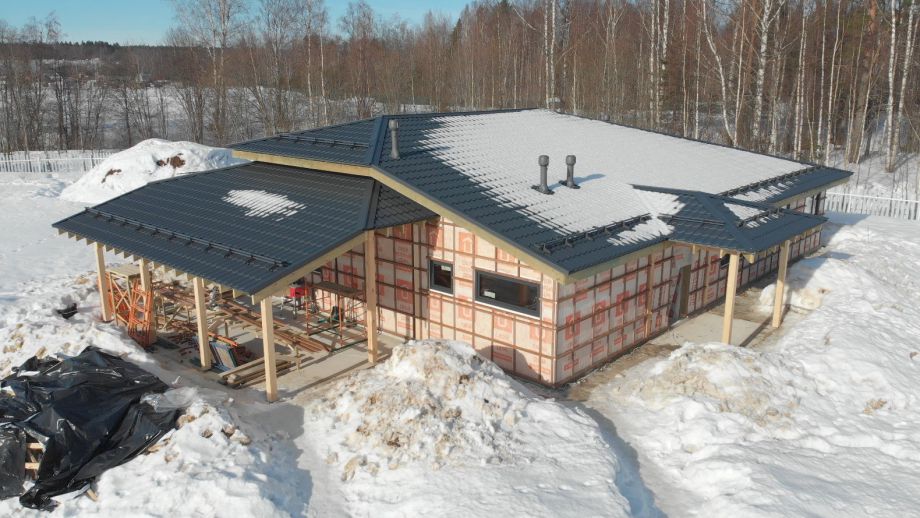 В клубном коттеджном поселке Сувантоярви, что под Санкт-Петербургом, мы построили интересный и объемный одноэтажный дом с потолками высотой 5м. и исчерпывающим количеством подсобных помещений - здесь 2 санузла, сауна, два гардероба, два техпомещения и своя купель.