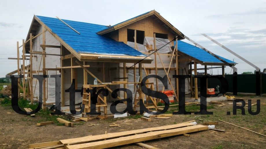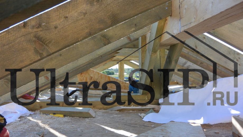 Нижняя часть стен обтянута ветровлагозащитной мембраной Rockwool. Заканчиваем сборку теплой мансардной крыши из СИП-панелей.