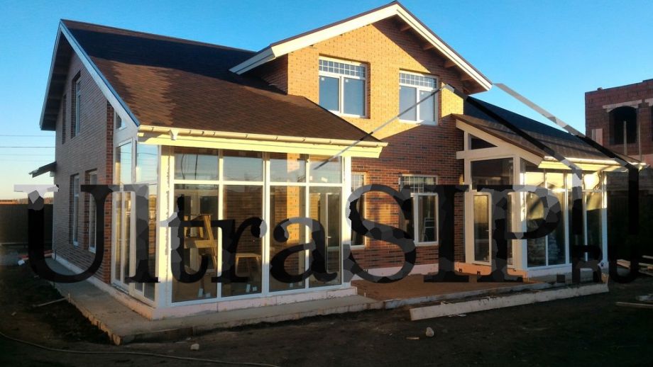 Красивый и солидный двухэтажный коттедж из СИП мы построили под Петергофом. СИП-панели: OSB-3 Калевала 12 мм, пенопласт завода "Новопласт" ПСБ-С25Ф высокой реальной плотности - от 16,7 кг/м3, клей ПУР производства BASF, Германия. Площадь СИП конструкций 280.8 м², площадь застройки 279.88 м². Предусмотрено два зимних сада и две террасы.
