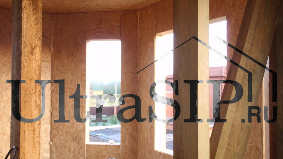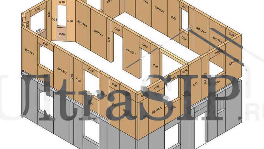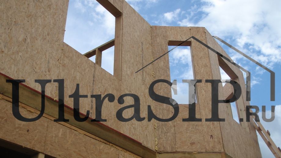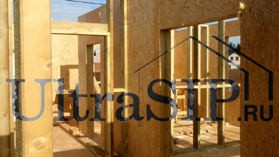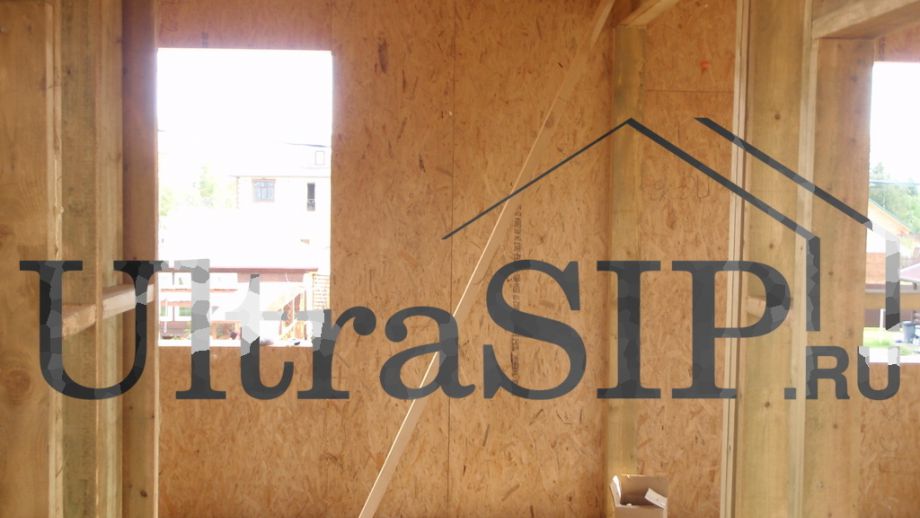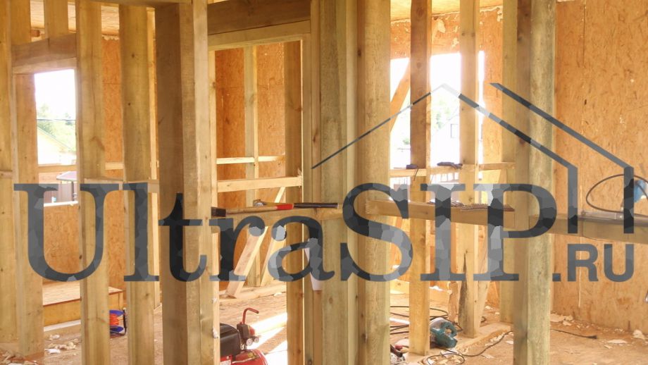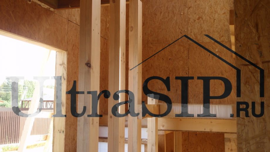 При проектировании все перегородки внутри дома решено сделать каркасными, кроме этой. Несущая перегородка из SIP значительно жестче каркасной, что придаст конструкции дома большую прочность.