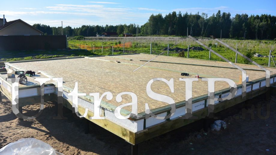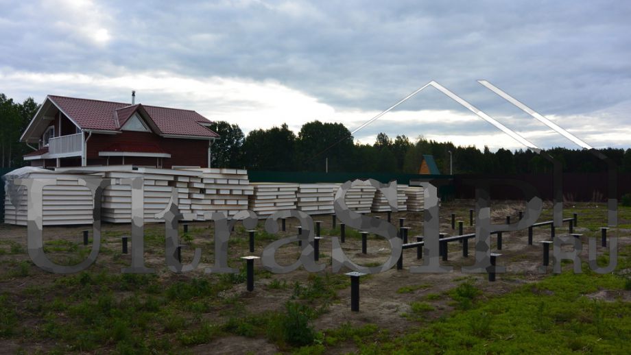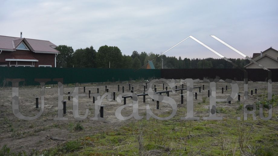 Участок выкошен, закручены винтовые сваи фундамента. По одной оси сваи обвязаны швеллером. Дом с трех сторон будет охвачен террасой, поэтому такое большое свайное поле. Принимаем фундамент у свайщиков.