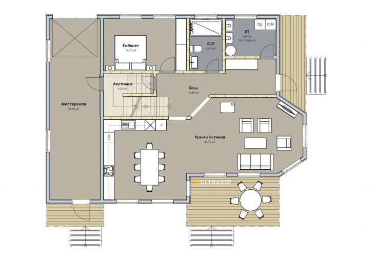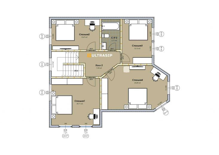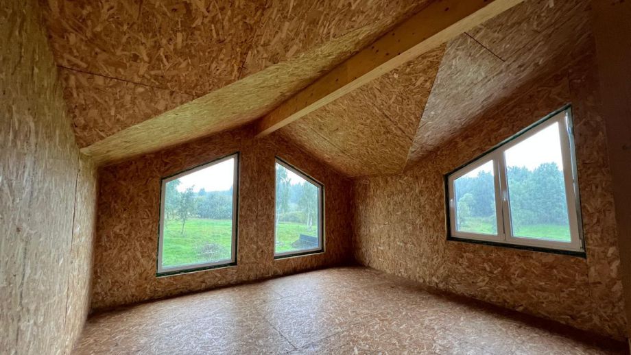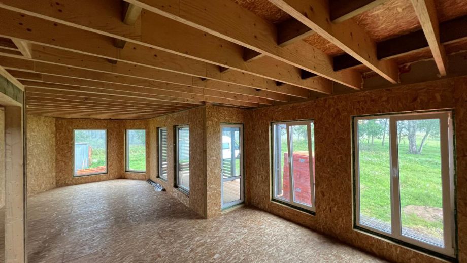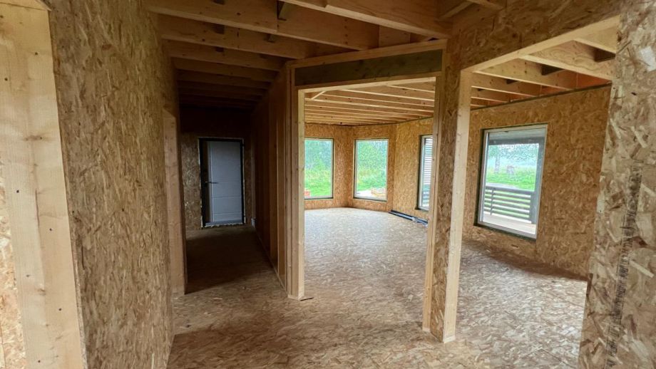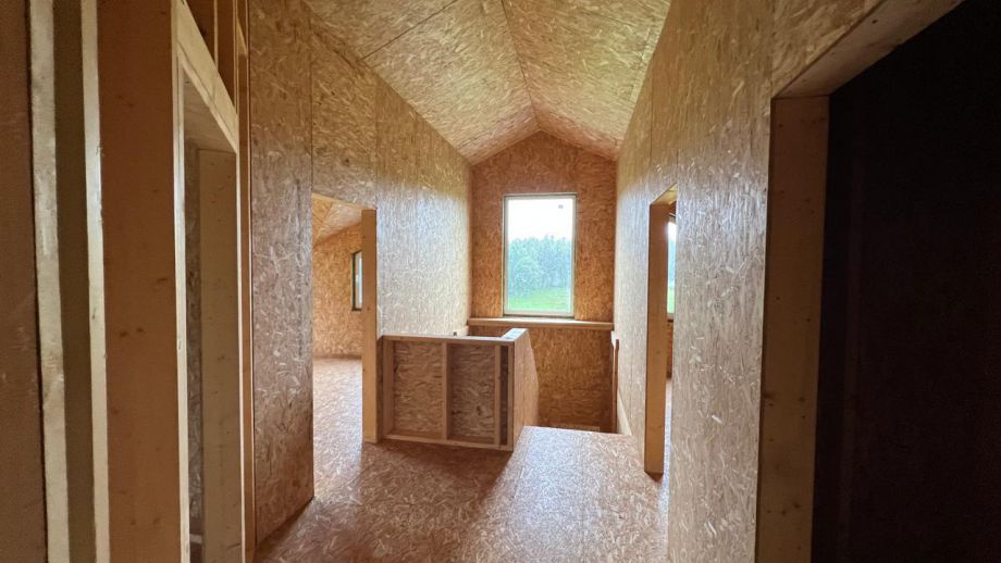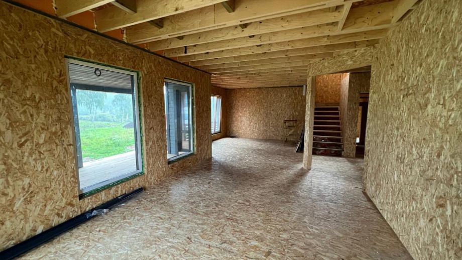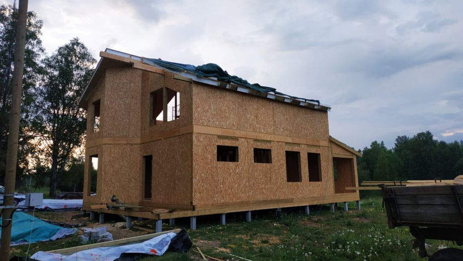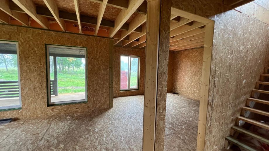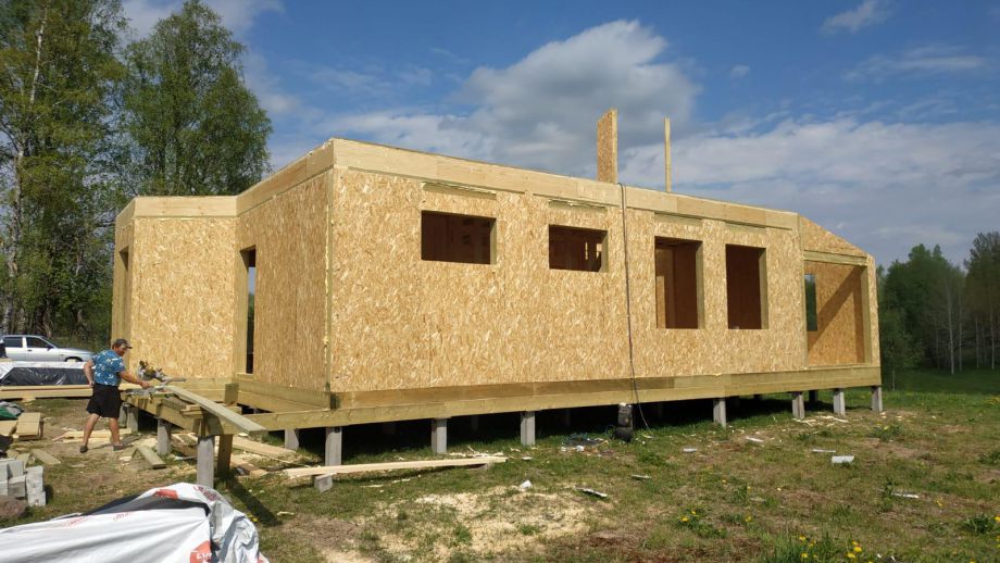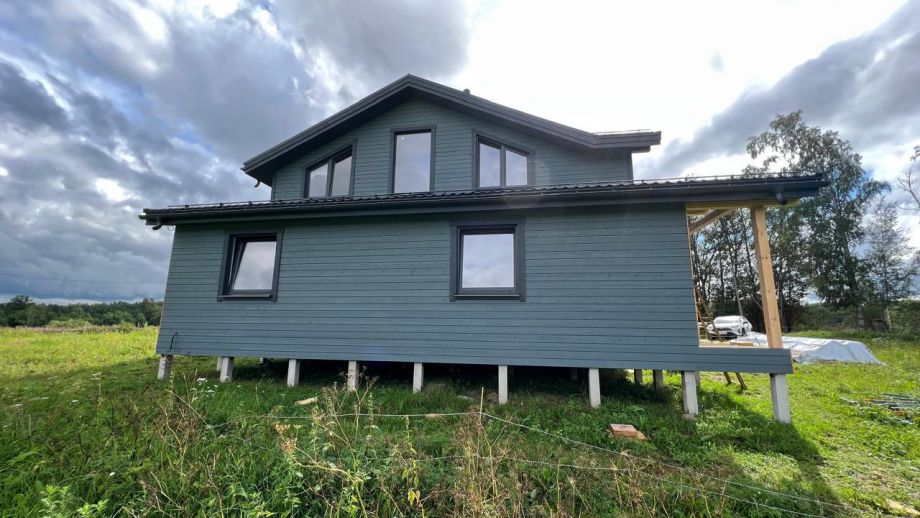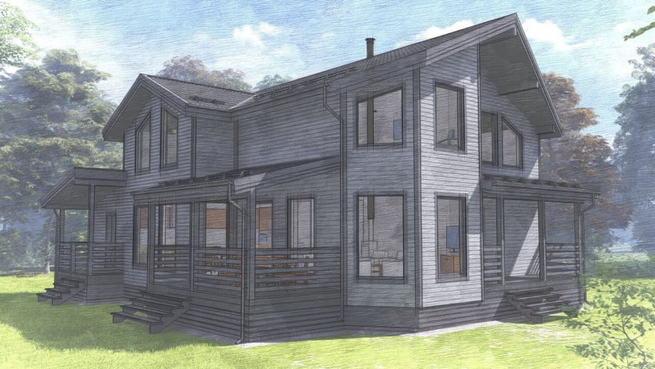 При проектировании этого дома был взят за основу построенный нами ранее дом в Турышкино. Мы адаптировали исходный проект под участок, вид из окон, соседей, пожелания заказчиков и учли сотни нюансов, и уже приступили к постройке этого дома. Пристроенная мастерская предназначена для ремонта сельскохозяйственной техники и имеет откатной заезд-пандус.