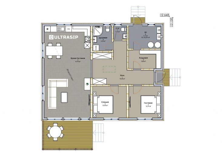Две комнаты достаточной площади, два санузла, кладовая, громадная для такой площади дома кухня-гостиная площадью 42м2. и техпомещение "с запасом" площадью 7м2. - все комфортно и удобно.