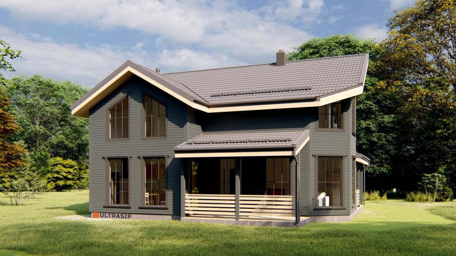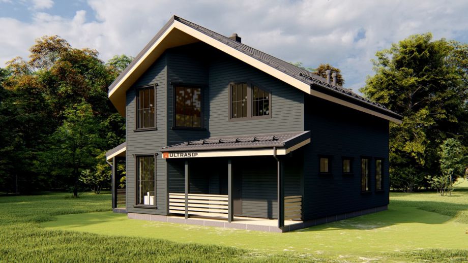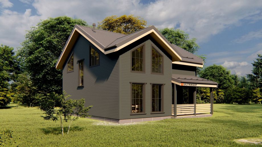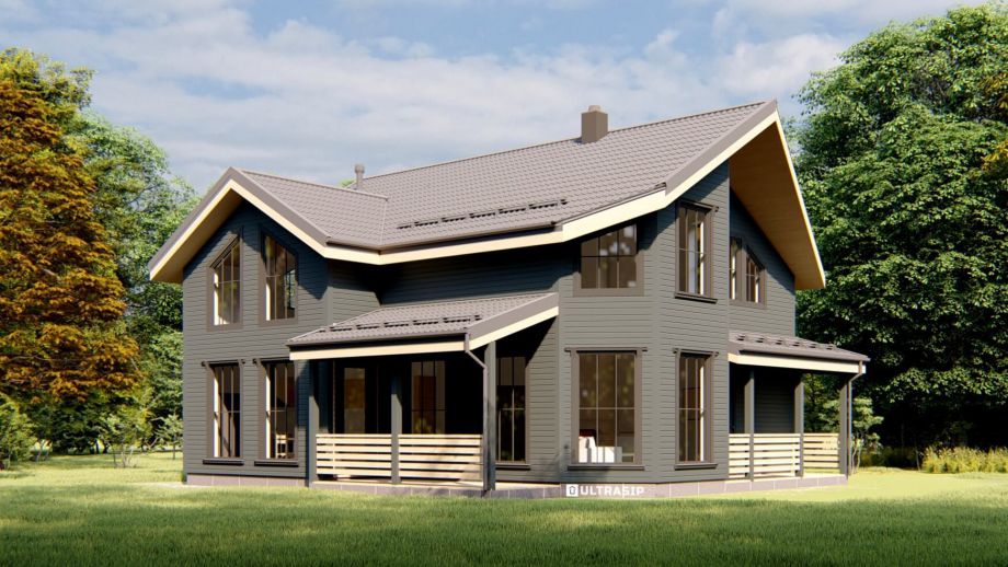 Проектом предусмотрено 5 спален, 2 санузла, гардеробная и обширная кухня-гостиная площадью 46 м2. Терраса площадью 16м2. ориентирована на запад.