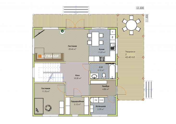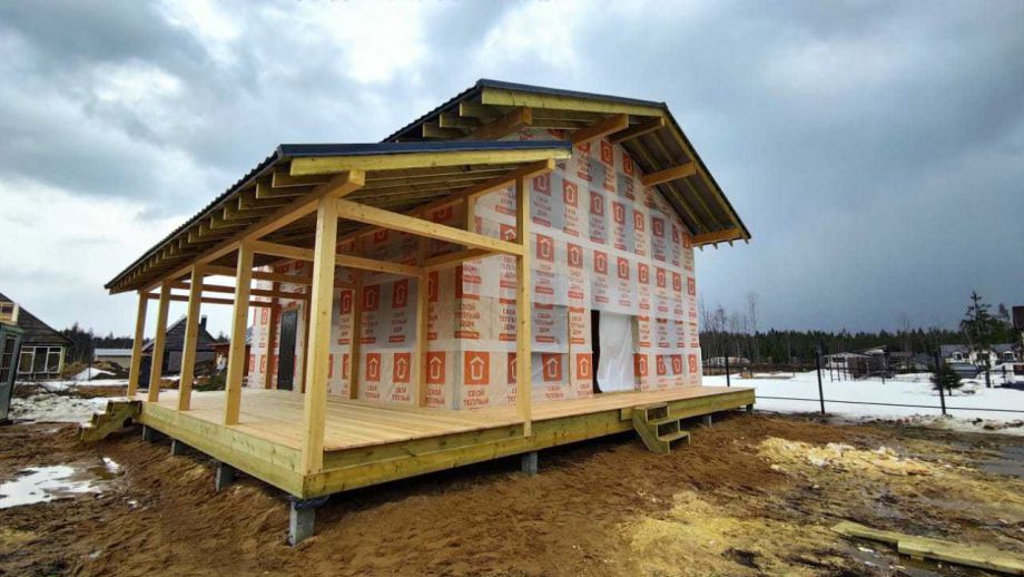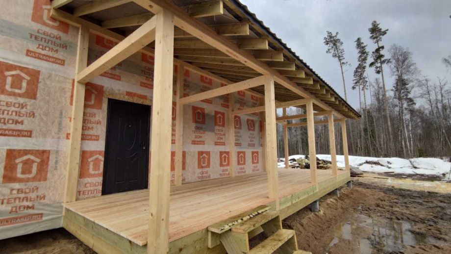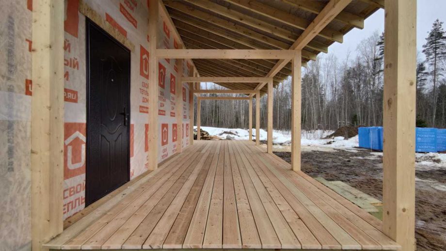 Цена указана за закрытый теплый контур - фундамент на ЖБ сваях, теплый контур, кровля, настил террасы, окна, дверь.