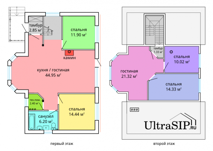 Высота стен первого этажа 2.8 м, площадь 84 м². "Изюминка " дома - разная площадь первого и полноценного второго этажа с высотой стен 2.5 м и площадью 48 м².