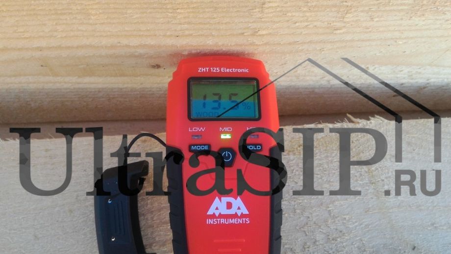 Для сборки домов из СИП мы используем только пиломатериал камерной сушки. При приемке на объекте влажность такой древесины должна колебаться в пределах 12-16%.