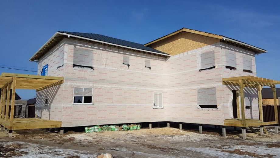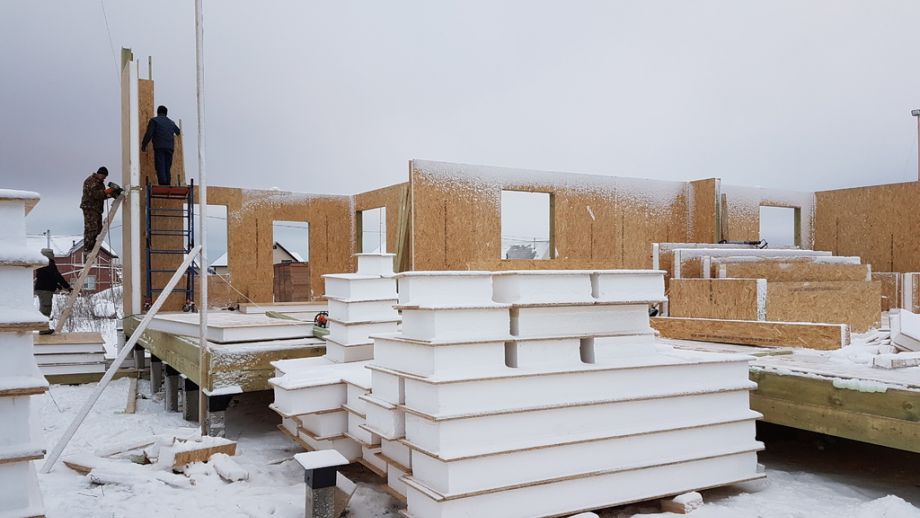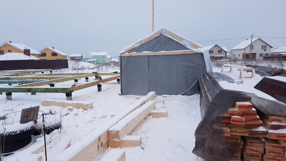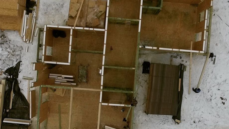 В уединенном коттеджном поселке под Ропшей мы построили этот нестандарный и непростой дом. Из необычного - дом опирается на фундамент из забивных (!) свай сечением 150х150 и длиной 3м. Сваи обвязаны антисептированным брусом 200х200 мм. СИП-панели московского производства (OSB-3 Калевала 12 мм, пенопласт завода "Новопласт" ПСБ -С25Ф высокой реальной плотности - 16,7 кг/м3, клей ПУР производства BASF, Германия). Нулевое и чердачное перекрытие из SIP панелей 224 мм, несущие стены из СИП-панелей 174 мм. Внутренние перегородки комбинированные - частично СИП 174мм, частично по каркасной технологии. Пиломатериал на конструктив дома приезжает камерной сушки влажностью 10-16%, откалиброванный на четырехстороннем станке и заранее обработанный антисептиком. Для антисептирования бруса обвязки и пиломатериала на стропильную систему на объекте строим "теплицы", в которых с помощью тепловых пушек поддерживаем плюсовую температуру.