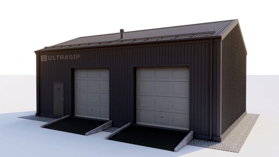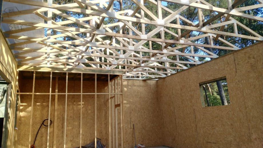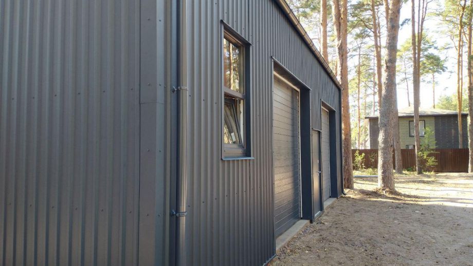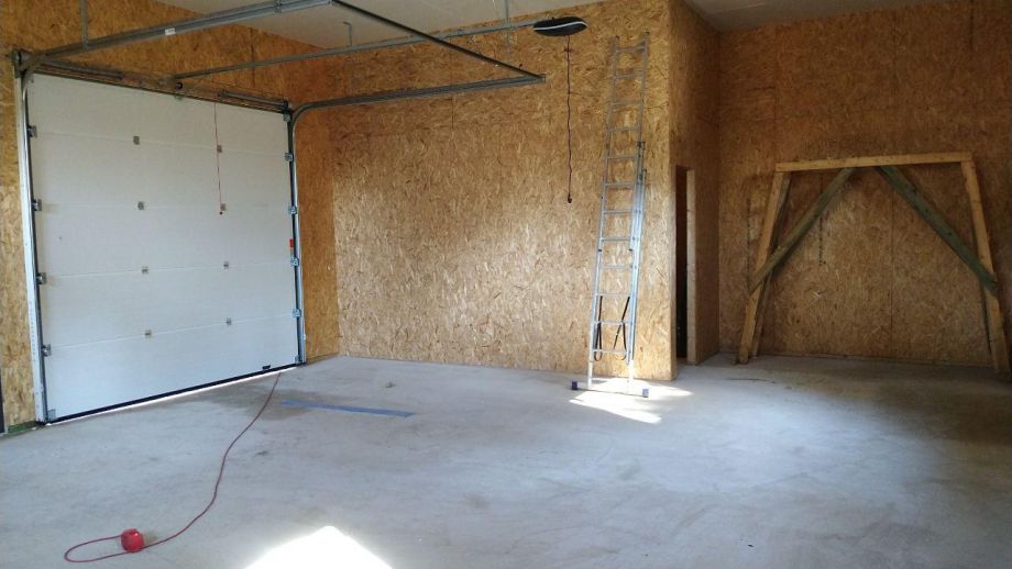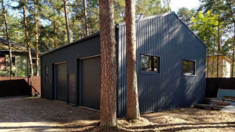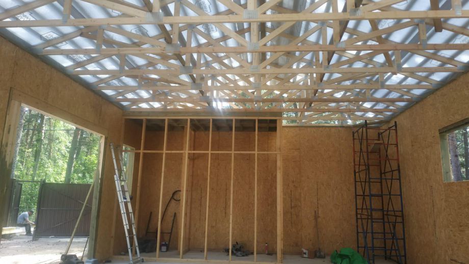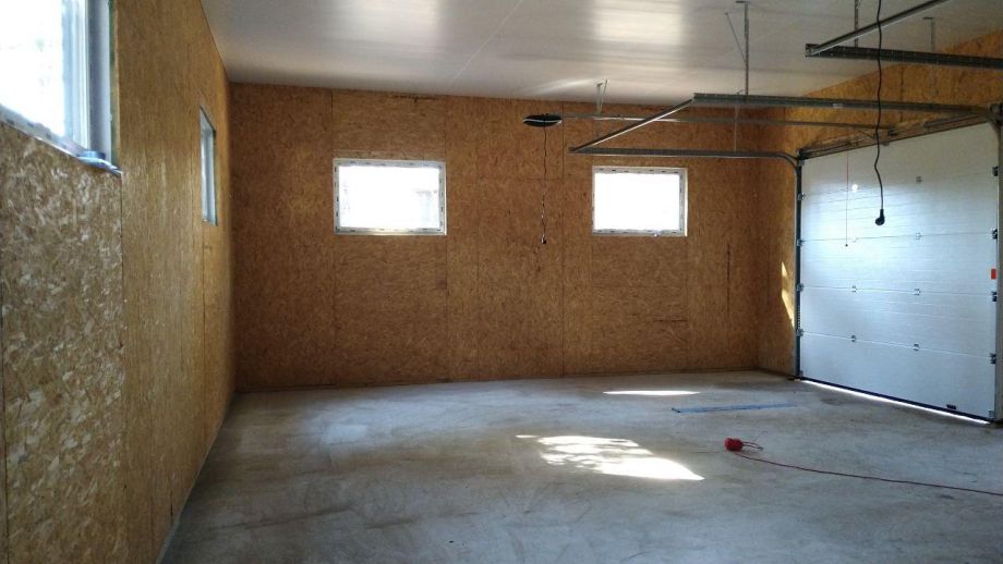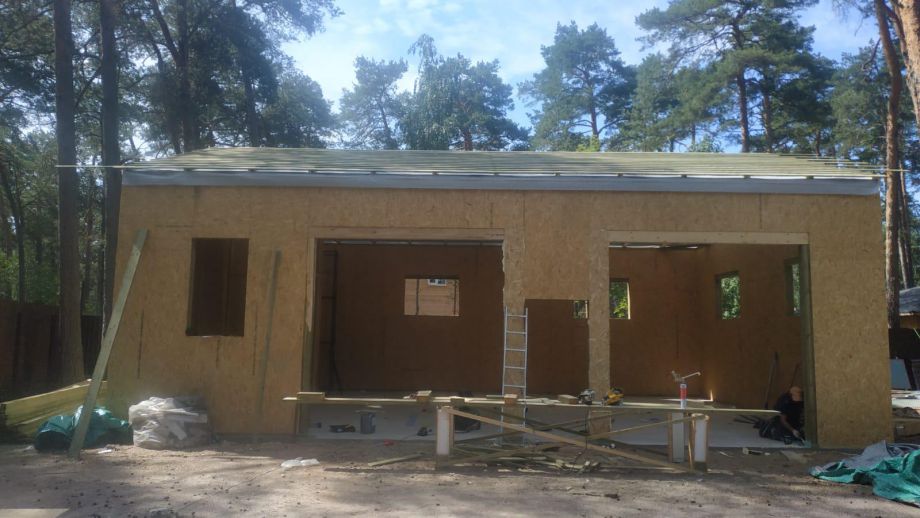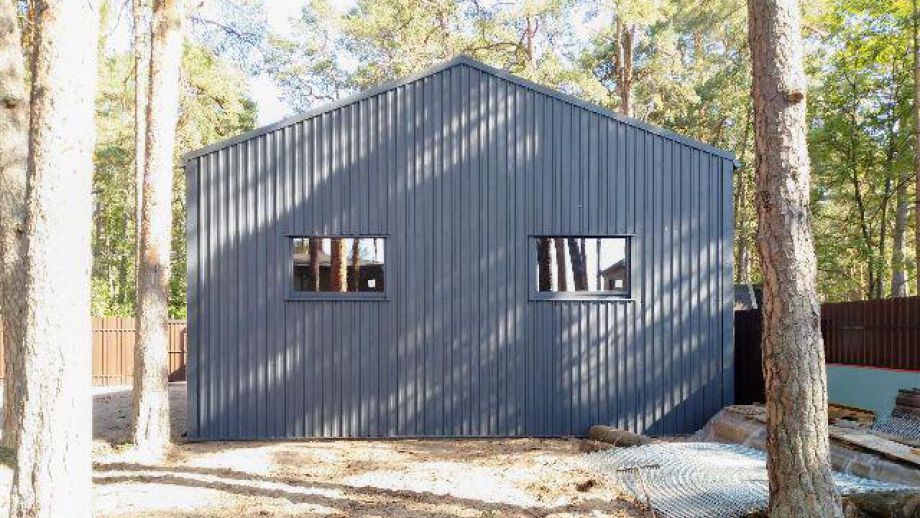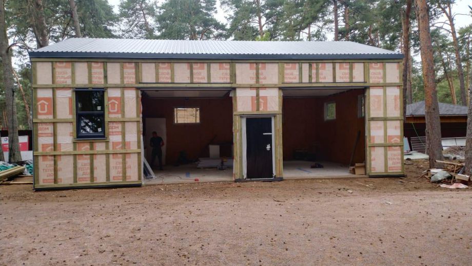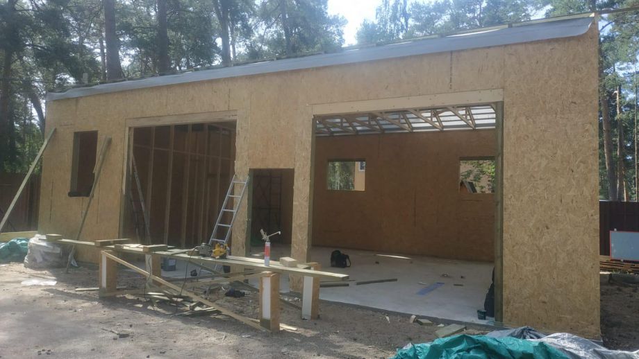 Заказчику этого гаража мы уже построили ранее дом в этом стиле, так что стиль (и материал стен) гаража был заранее предопределен. Итак, гараж 8х12м. с высотой стен 4м., предназначен для ремонта гоночных автомобилей. Стропильная система - фермы заводского изготовления на металло-зубчатых пластинах.