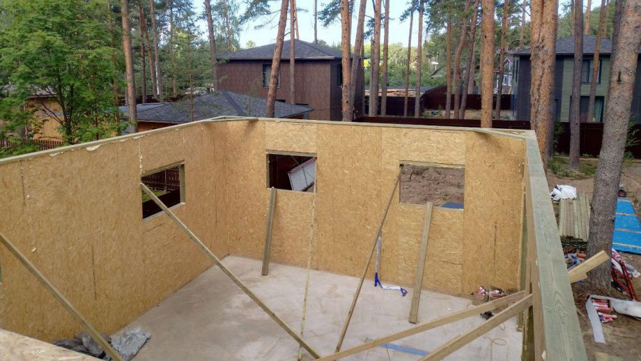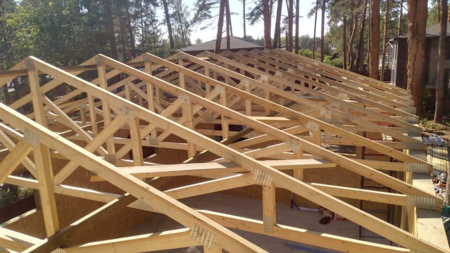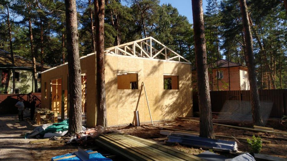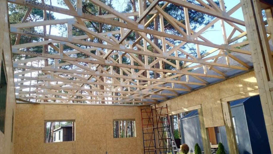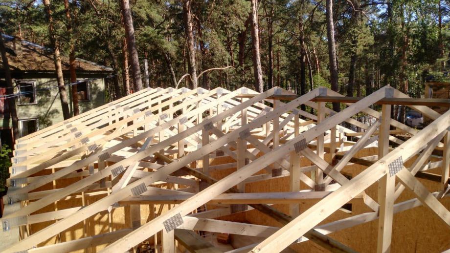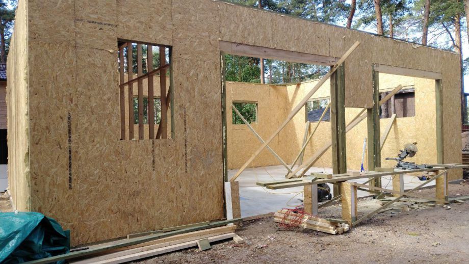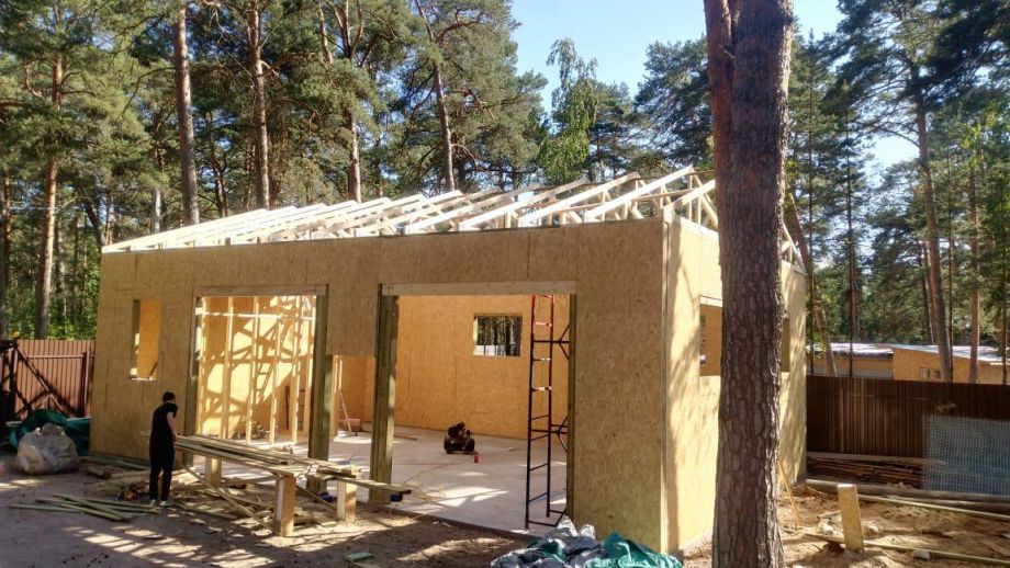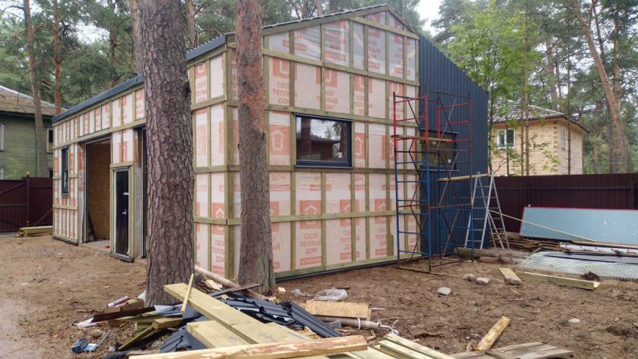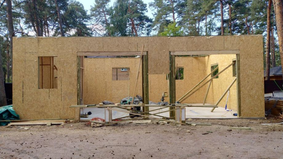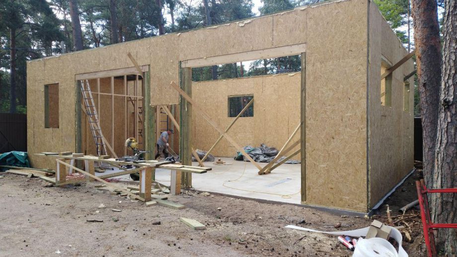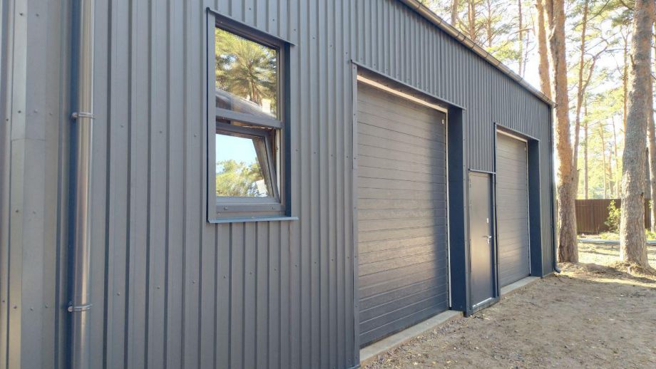 Заказчику этого гаража мы уже построили ранее дом в этом стиле, так что стиль (и материал стен) гаража был заранее предопределен. Итак, гараж 8х12м. с высотой стен 4м., предназначен для ремонта гоночных автомобилей. Стропильная система - фермы заводского изготовления на металло-зубчатых пластинах.
