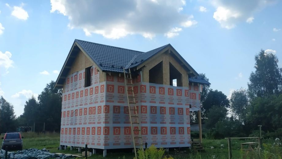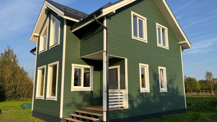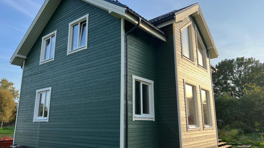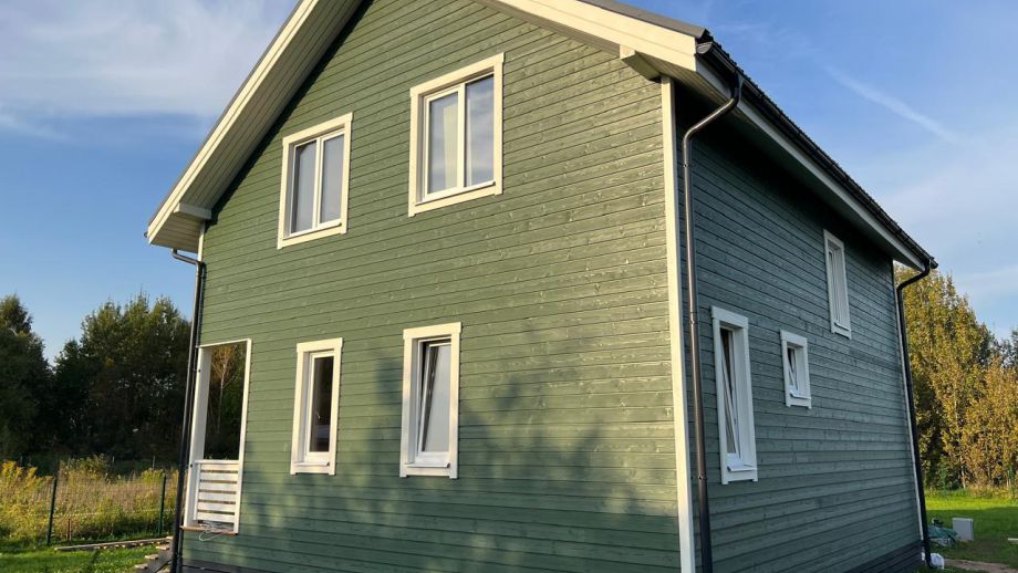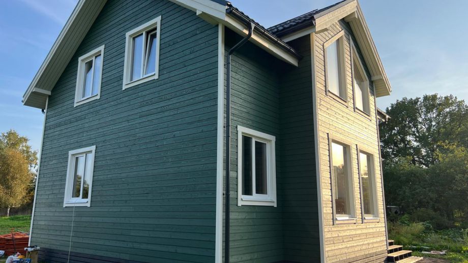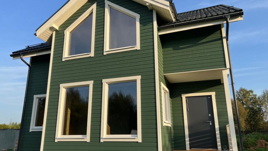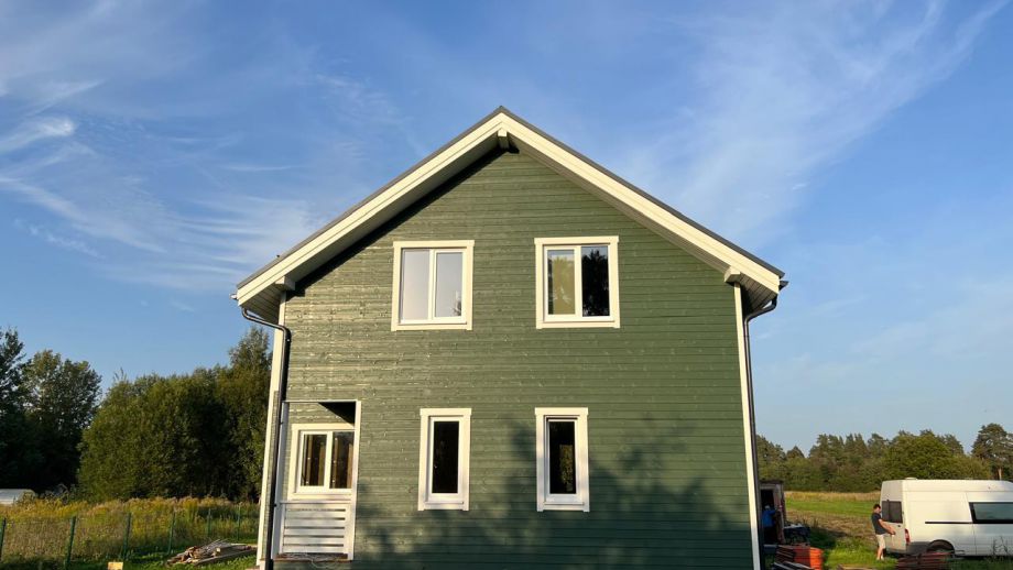 Дом построен в комплектации Оптимум - это дом с фасадом, окнами, входной дверью, системами снегозадержания и водостока, террасой, балконом, перилами, крылечками, отделка цоколя, вентпакет УЛЬТРАВЕНТ, и конечно доставка и качественная сборка со всеми комплектующими.
