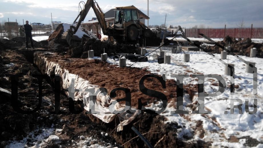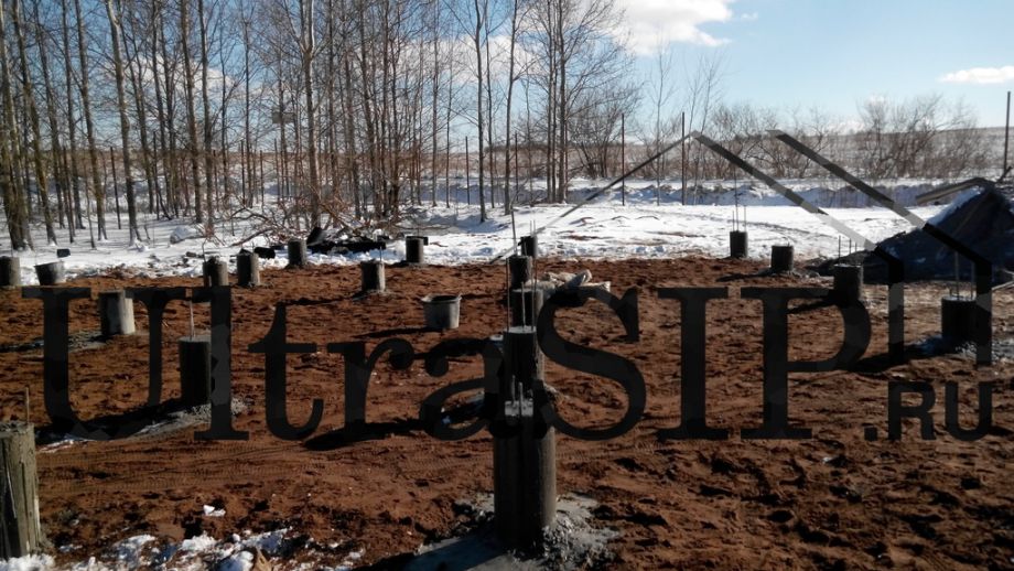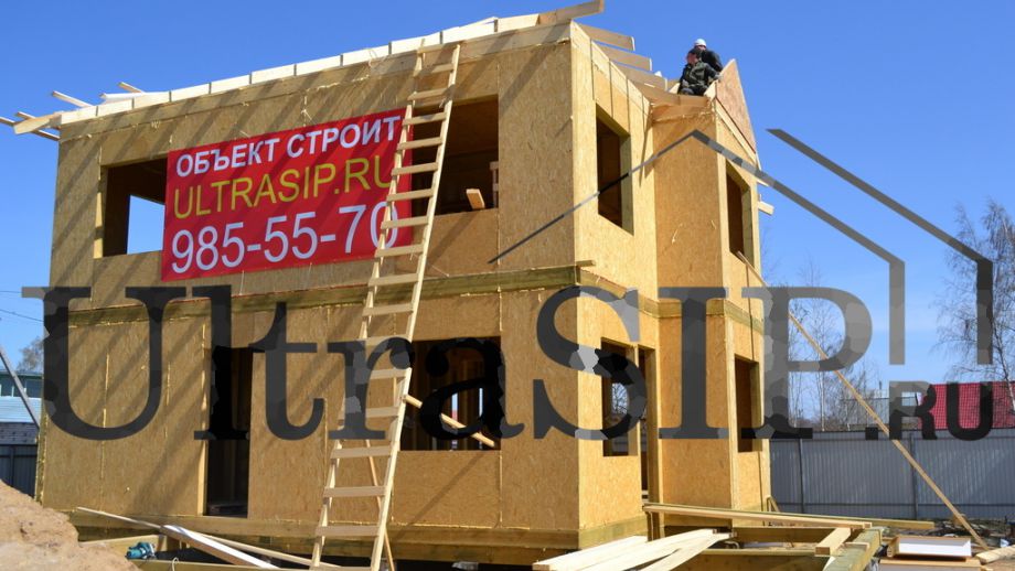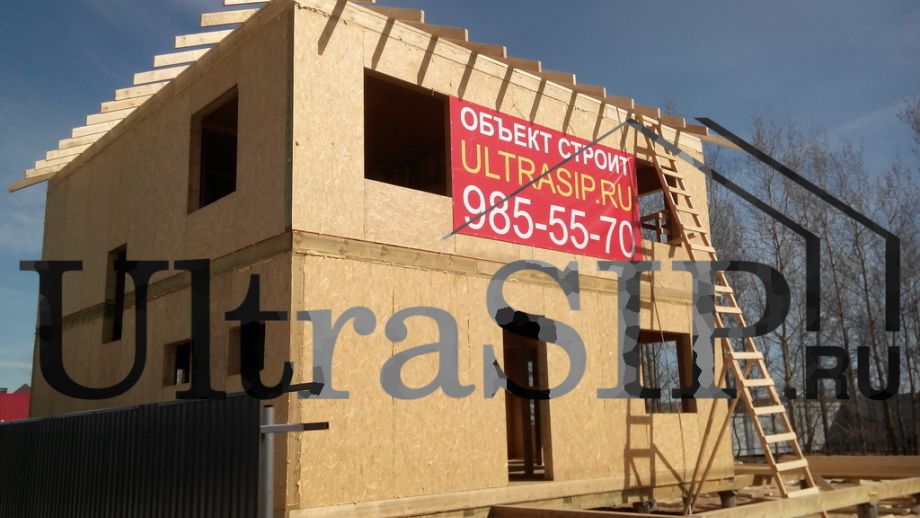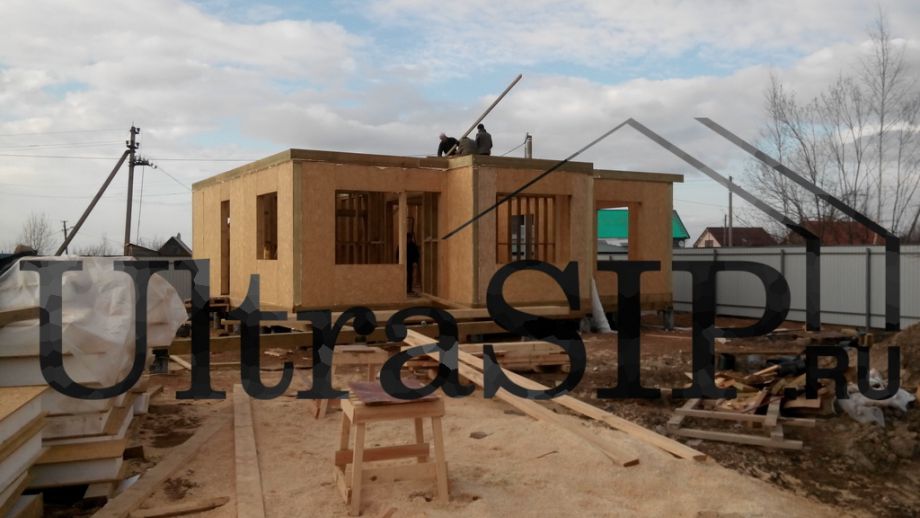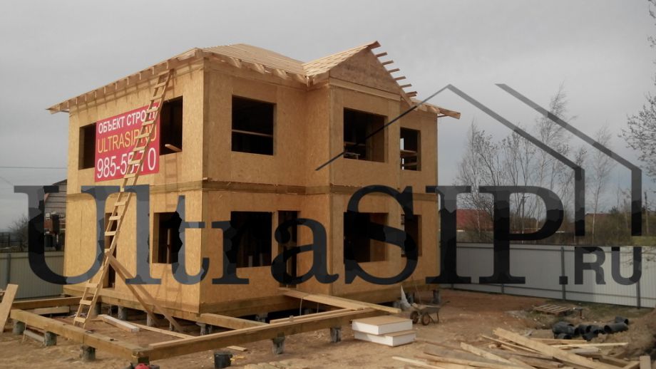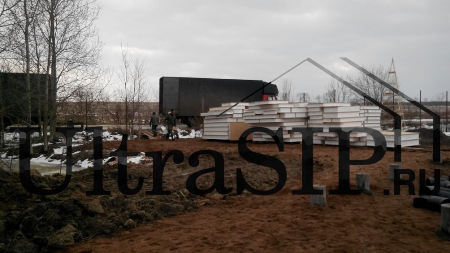 Для большей жесткости нулевое перекрытие собрано из СИП-панелей шириной 625 мм. Идет сборка стен первого этажа.