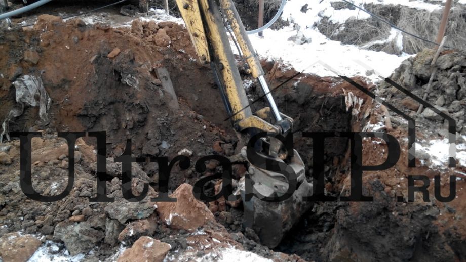 Экскаватор роет траншею для дренажной системы. Виден белый геотекстиль, сверху присыпанный слоем песка.