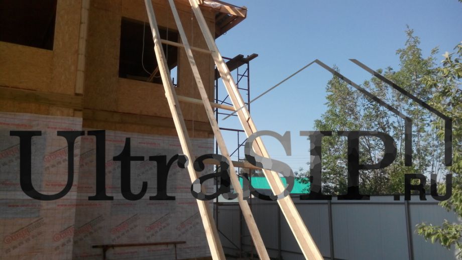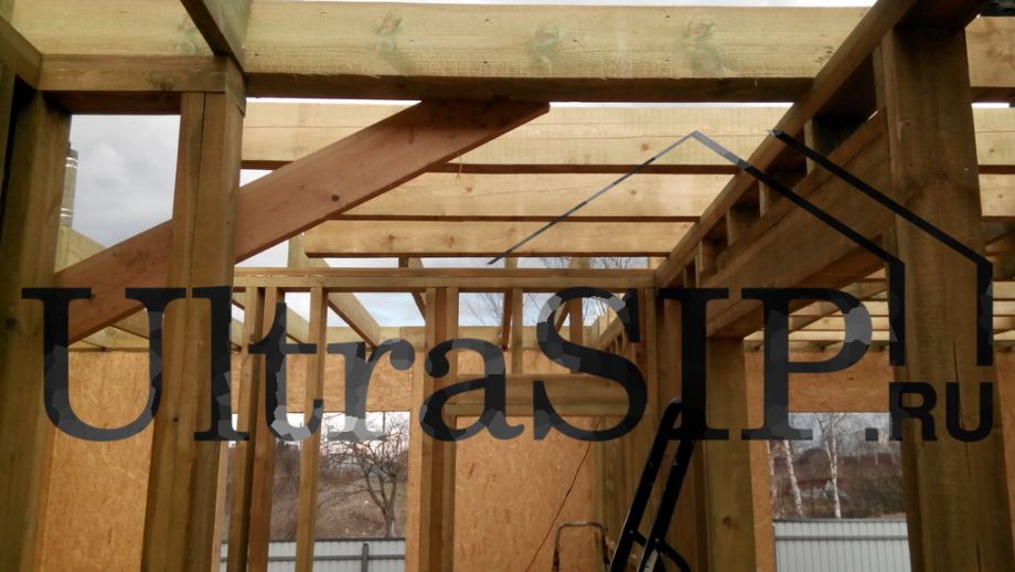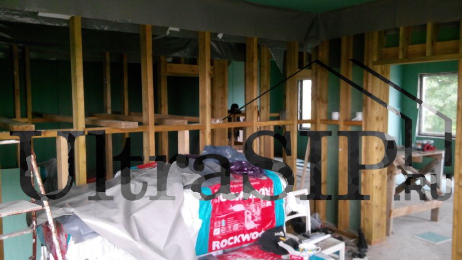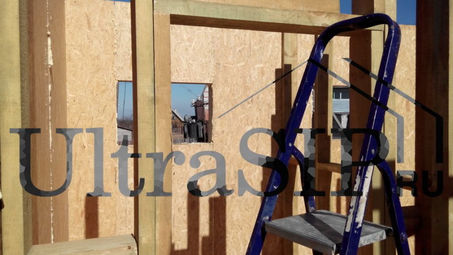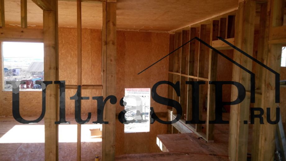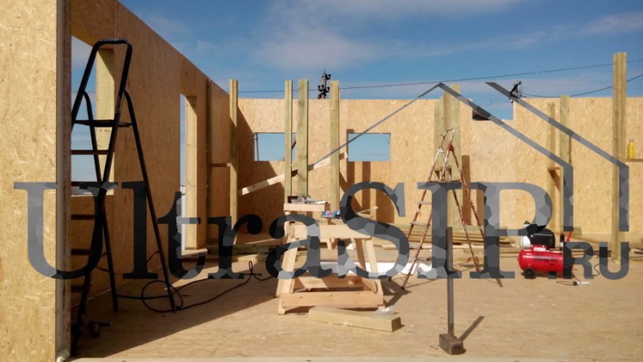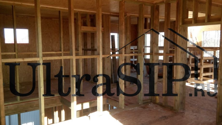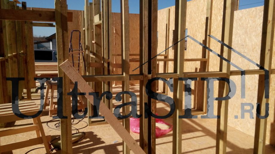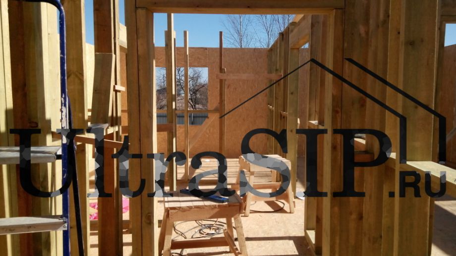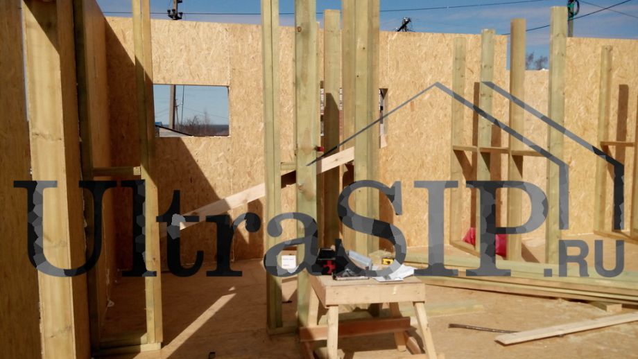 Одновременно собираем стены из СИП и внутренние каркасные перегородки.