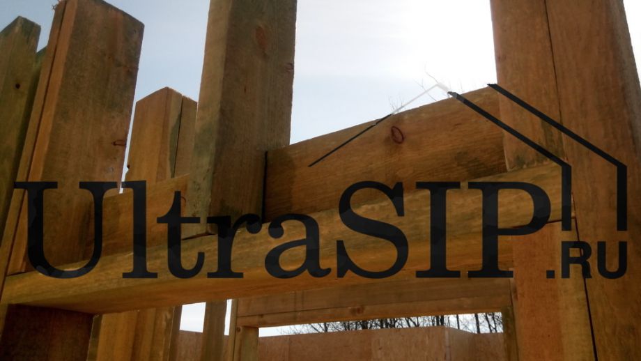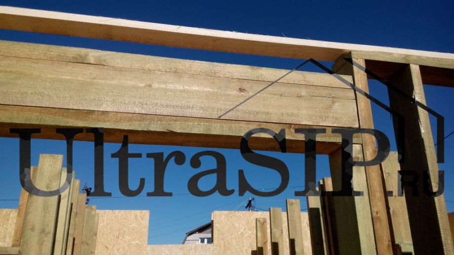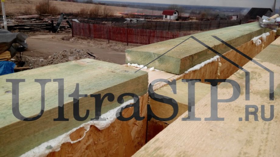 Готовим верхний торец СИП-панели к настилу каркасного межэтажного перекрытия. В выборку панели установлена так называемая 'торцевая' доска, сверку для распределения нагрузки от балок перекрытия уложена 'обвязочная' доска. В зазор в центре фото будет уложена доска, которая дополнительно свяжет стену из СИП и примыкающую к ней каркасную перегородку.