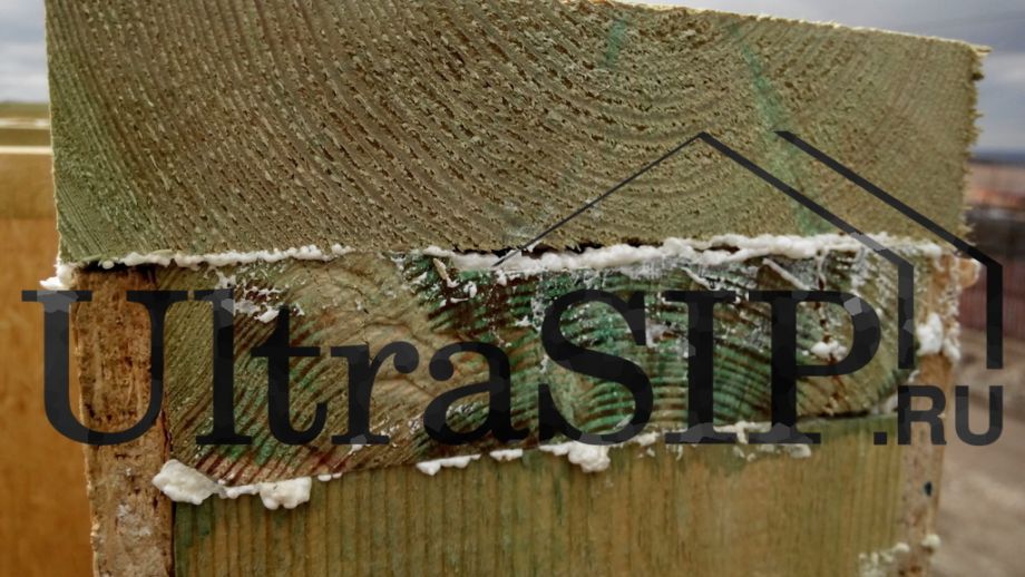 Торец стены в месте будущего оконного проема, проходящего на уровне перекрытия. Доски, которые заложены в торец СИП-панели, заранее подвергнуты камерной сушке, а затем обработаны антисептиком, который придал дереву зеленую окраску. Во всех стыках присутствует монтажная пена, которая заполняет пустоты, а также дополнительно склеивает части конструкции.