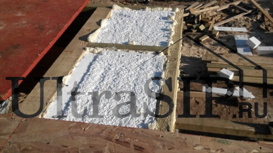 Щели между пенополистиролом и деревом заполнены монтажной пеной. Сейчас мы нанесем сверху слой пены и уложим на него лист ОСБ, формирующий 'Черный' пол второго этажа.