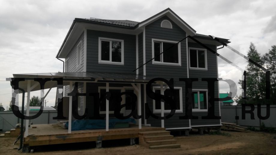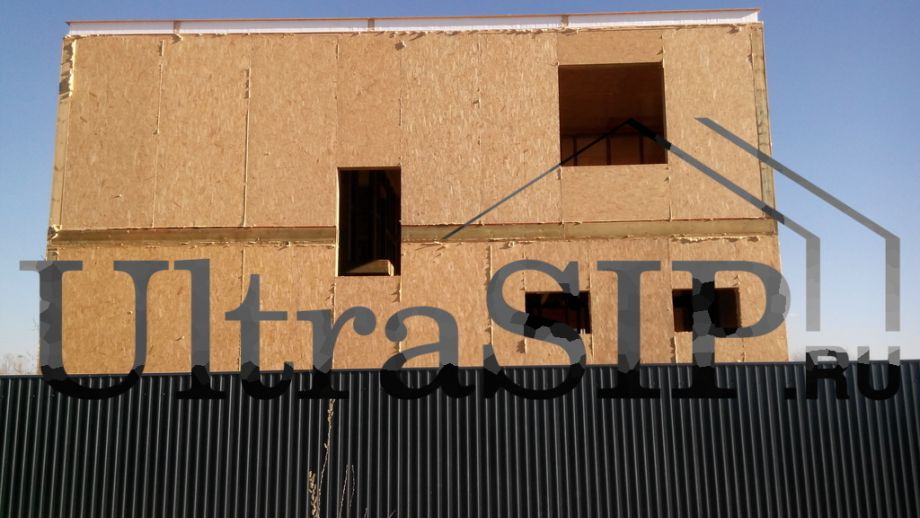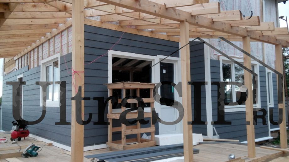 Южная стена дома. Стена из СИП-панелей покрыта паропроницаемой мембраной. Фасад частично забран смарт-сайдингом.