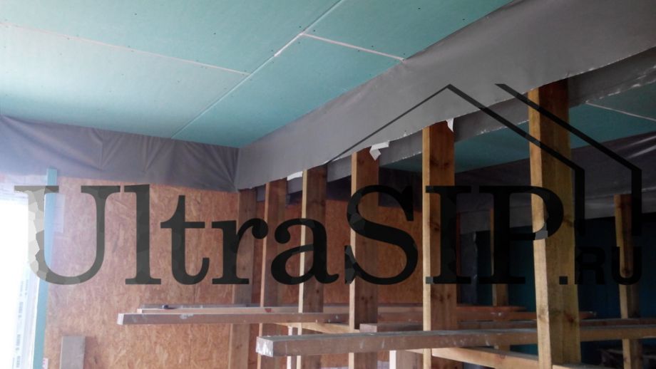 Идет отделка. Стены из СИП защищены от проникновения пара изнутри толстым полиэтиленом, который прижат листами гипсокартона.