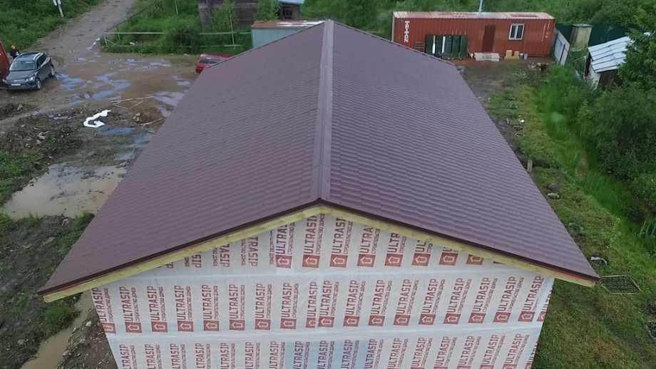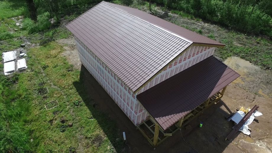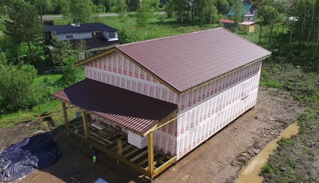 Фундамент на винтовых сваях предоставлен нам заказчиком. Домокомплект из СИП панелей ULTRASIP® EXTRA (OSB-3 Калевала 12 мм, пенопласт ППС-17 высокой реальной плотности - 17,5 кг/м3). Нулевое и чердачное перекрытия SIP панелей толщиной 224 мм, наружные стены из СИП-панелей 174 мм. Перегородки внутри дома выполнены по каркасной технологии из доски 45х145. Пиломатериал, применяемый при сборке дома - камерной сушки влажностью 10-16%, простроган на четырехстороннем станке, и заранее, в цеху, обработан антисептиком.