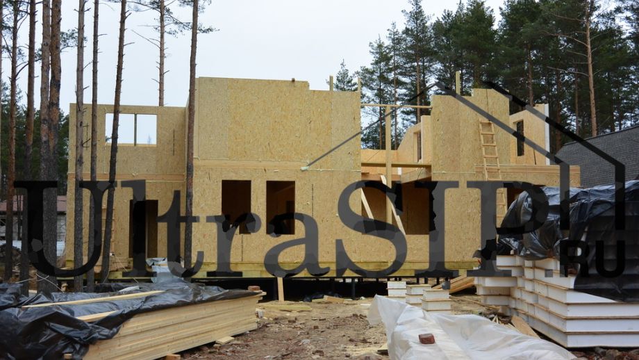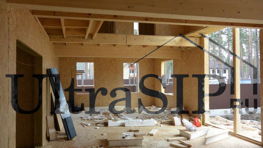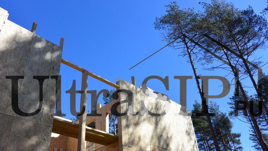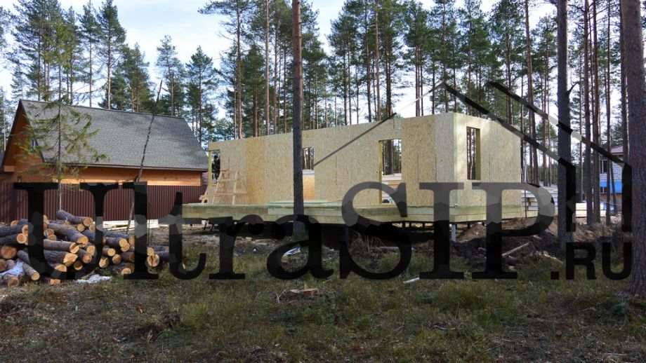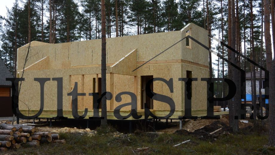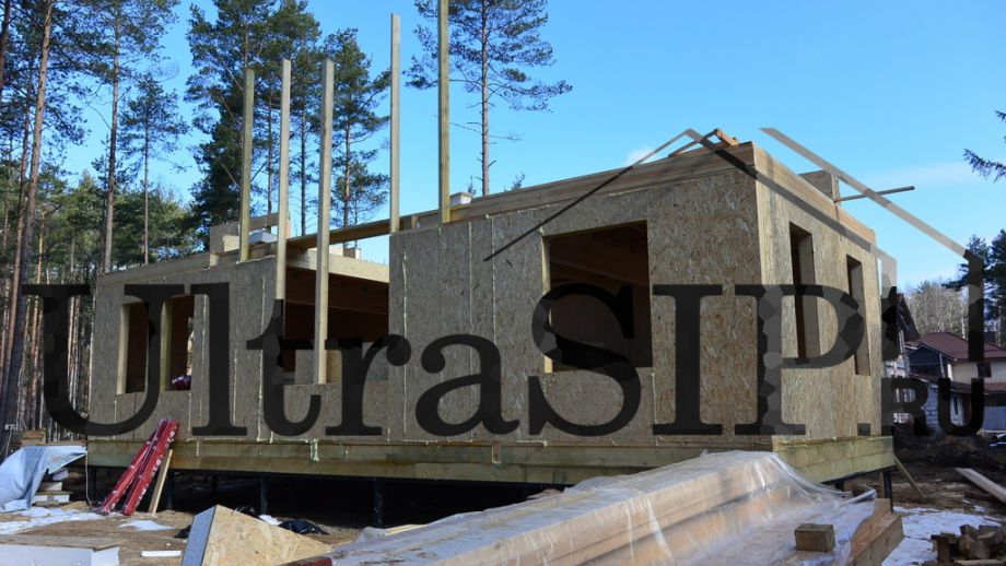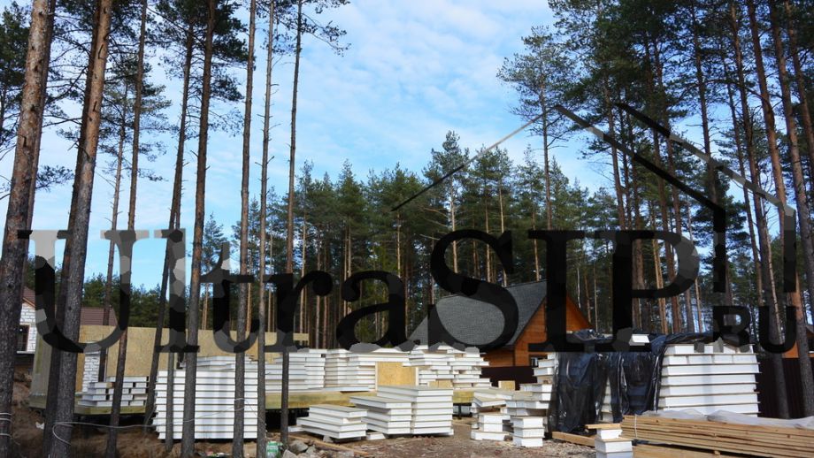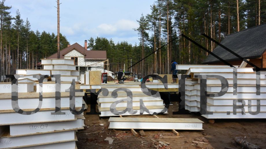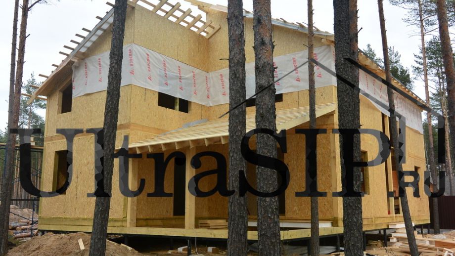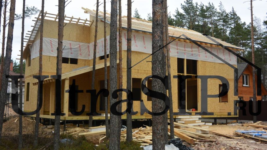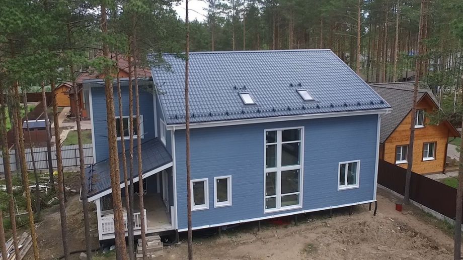 Винтовой фундамент на сваях диаметром 108мм и длиной 10,5м(!), обвязанных швеллером 160мм. Обвязка брусом 200х200 мм. Домокомплект из СИП панелей (OSB-3 Калевала 12 мм, пенопласт завода "Новопласт" ПСБ -С25Ф высокой реальной плотности - от 16,7 кг/м3, клей ПУР производства BASF, Германия). Нулевое перекрытие и крыша из SIP панелей 224 мм, несущие стены из СИП-панелей 174 мм. Часть перегородок из СИП, часть - каркасные. Пиломатериал из отборного пиловочника хвойных пород, высушен в камере до влажности 12-16%, калиброван на рейсмусном станке, обработан антисептиком. Три односкатных кровли, покрытых металлочерепицей.
