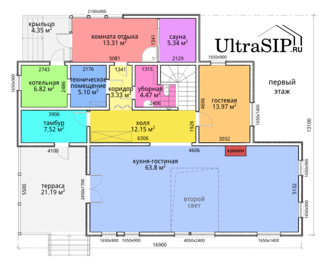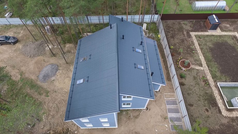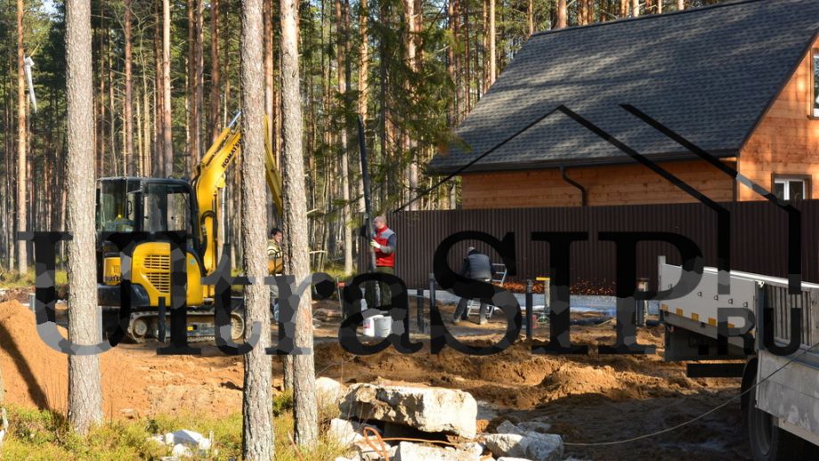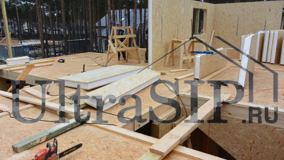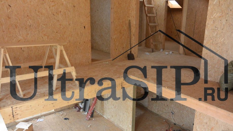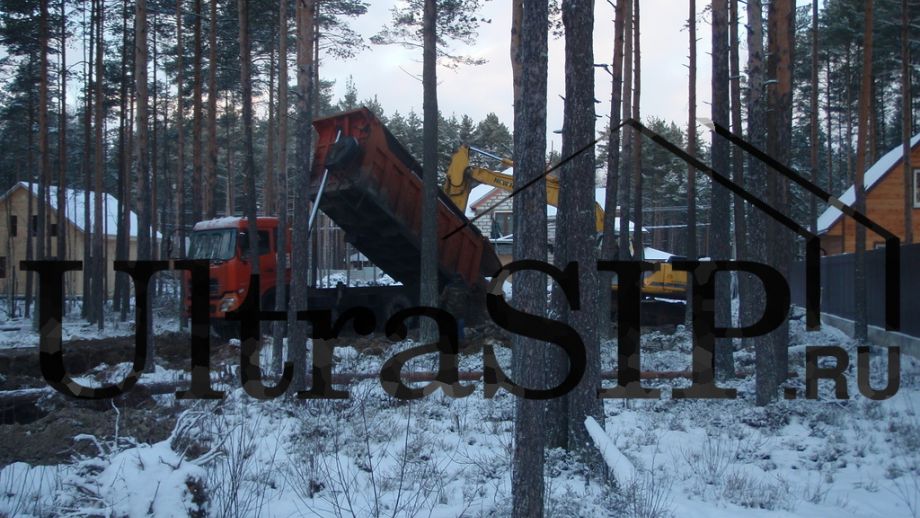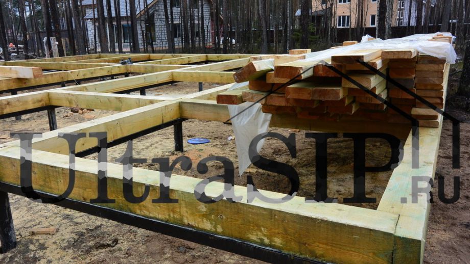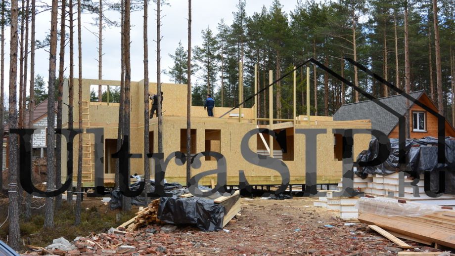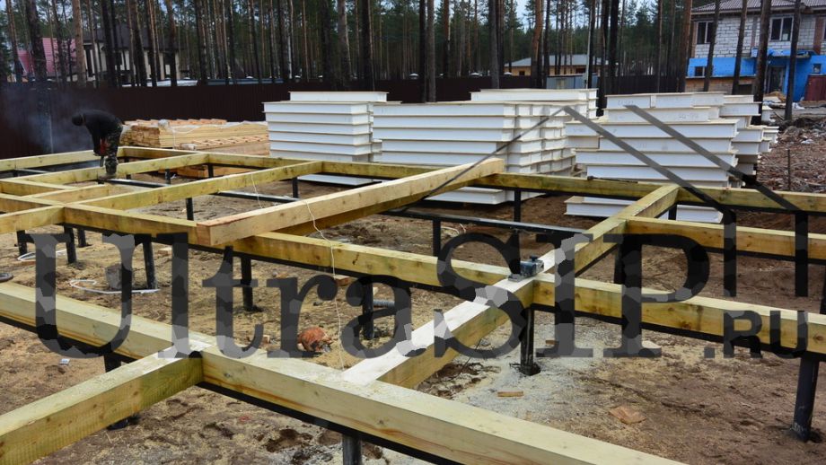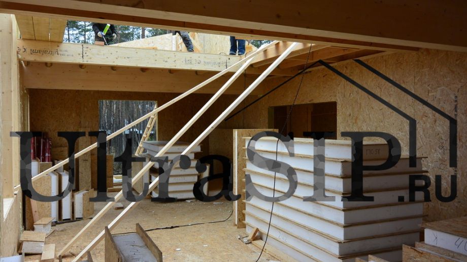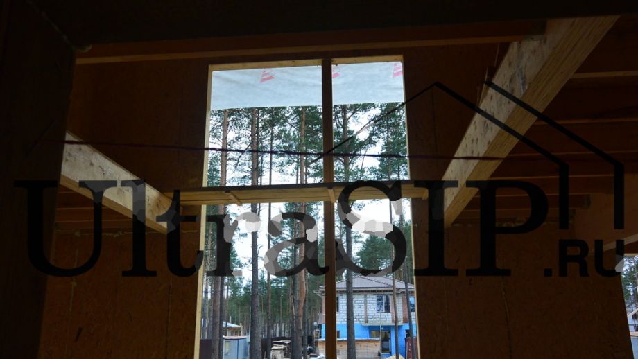 Винтовой фундамент на сваях диаметром 108мм и длиной 10,5м(!), обвязанных швеллером 160мм. Обвязка брусом 200х200 мм. Домокомплект из СИП панелей (OSB-3 Калевала 12 мм, пенопласт завода "Новопласт" ПСБ -С25Ф высокой реальной плотности - от 16,7 кг/м3, клей ПУР производства BASF, Германия). Нулевое перекрытие и крыша из SIP панелей 224 мм, несущие стены из СИП-панелей 174 мм. Часть перегородок из СИП, часть - каркасные. Пиломатериал из отборного пиловочника хвойных пород, высушен в камере до влажности 12-16%, калиброван на рейсмусном станке, обработан антисептиком. Три односкатных кровли, покрытых металлочерепицей.