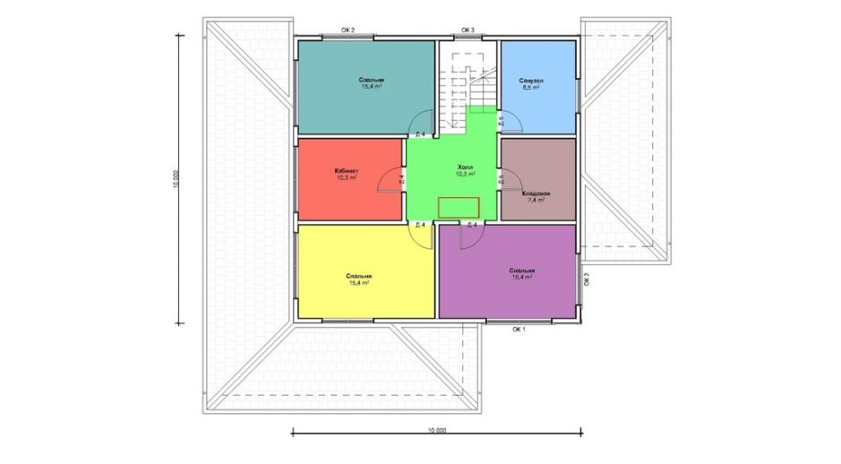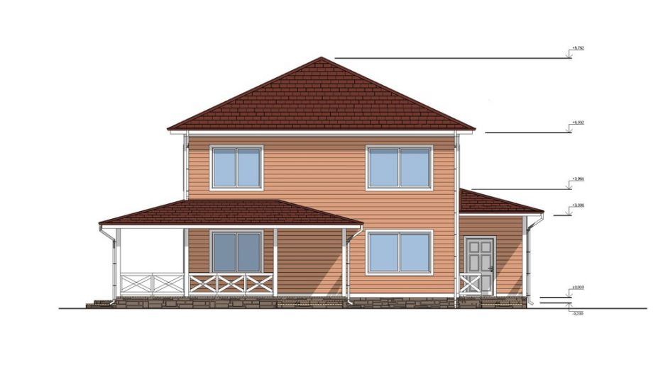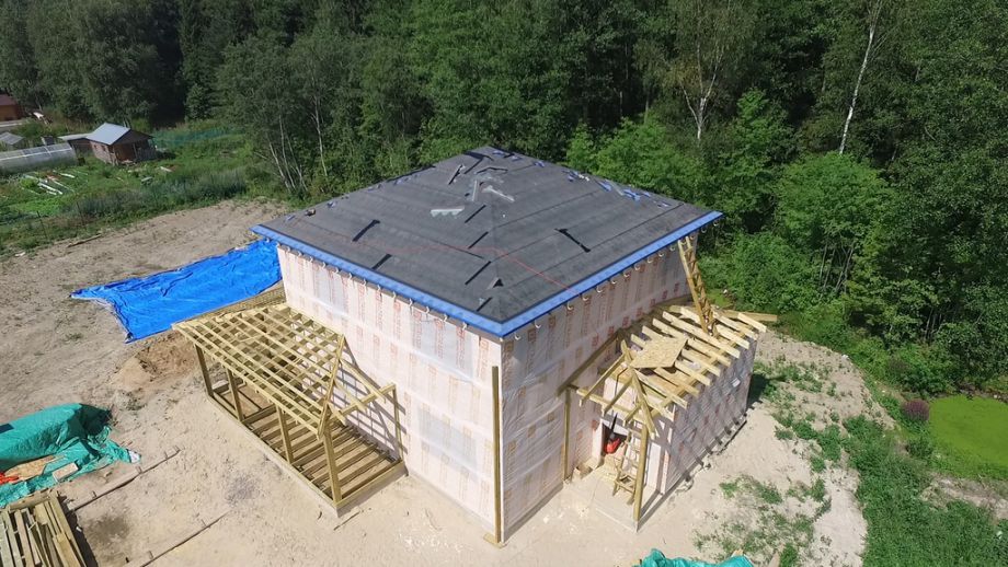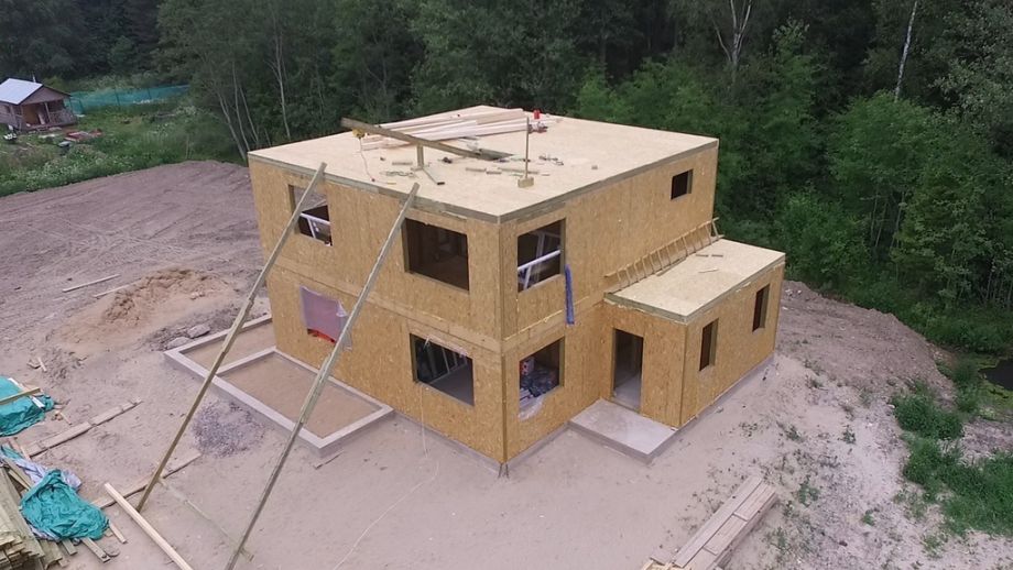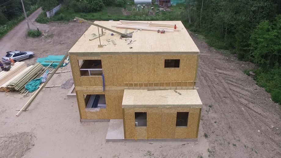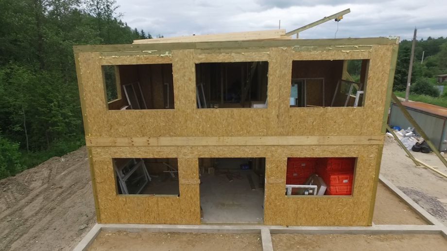 Чердачное перекрытия SIP панелей толщиной 224 мм, межэтажное - по каркасной технологии. Наружные стены из СИП-панелей 174 мм. Перегородки внутри - каркасные, обшиты с одной стороны ОСБ 12 мм.