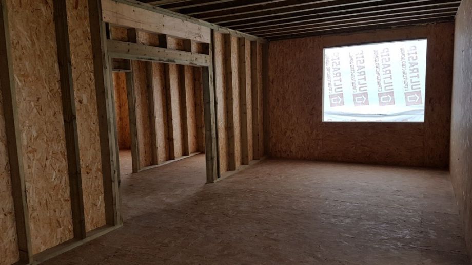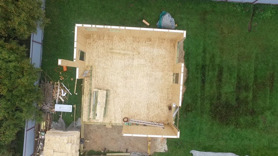 Высота стен первого этажа 2,8 и второго - 2,5 метра. Фундамент на винтовых сваях диаметром 108 мм. Домокомплект из СИП панелей ULTRASIP® EXTRA (OSB-3 Калевала 12 мм, пенопласт ППС-17 высокой реальной плотности - 17,5 кг/м3). Нулевое и чердачное перекрытие - SIP панели толщиной 224 мм, межэтажное - по каркасной технологии. Наружные стены из СИП-панелей 174 мм. Перегородки внутри - каркасные, обшиты ОСБ 12 мм. Пиломатериал, применяемый при сборке дома - камерной сушки влажностью 10-16%, простроган на четырехстороннем станке, и заранее, в цеху, обработан антисептиком. Почему это действительно важно - подробно описано здесь.