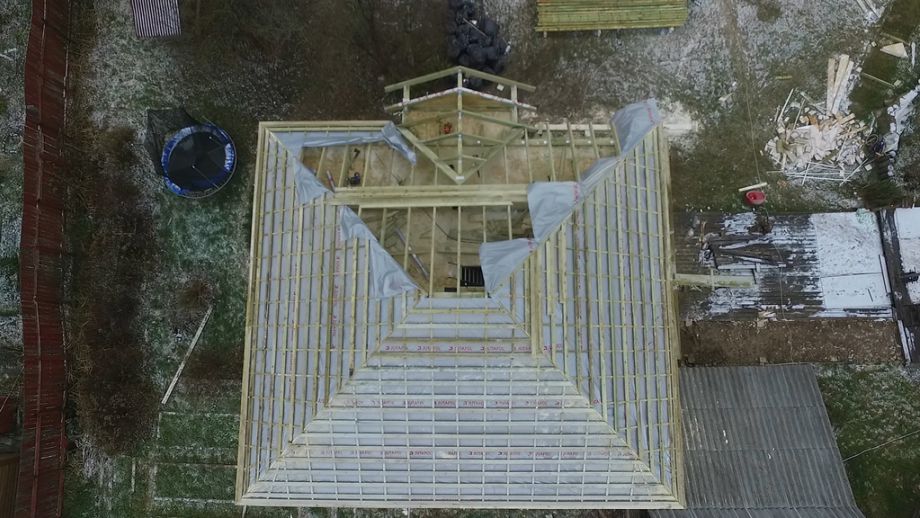 Собрана стропильная система. Идет монтаж подкровельной мембраны, контробрешетки и обрешетки под металлочерепицу.