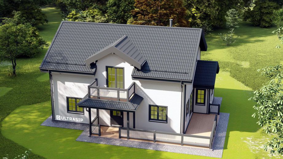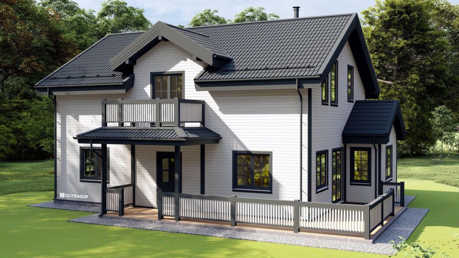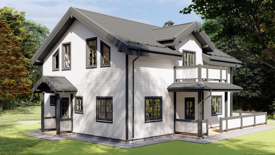 - архитектура дома - мансардный второй этаж с мансардными окнами, балкон с "юбкой" по периметру, открытая терраса и обширная кухня-гостиная - яркий образец классической скандинавской школы;