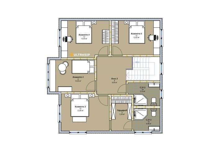 Узкий участок потребовал отказаться от удобной Г-образной террасы, но в целом логика расположения помещений привычная. Как обычно, проект доработан под требования участка, заказчика и здравого смысла.