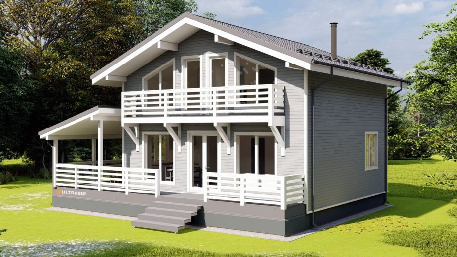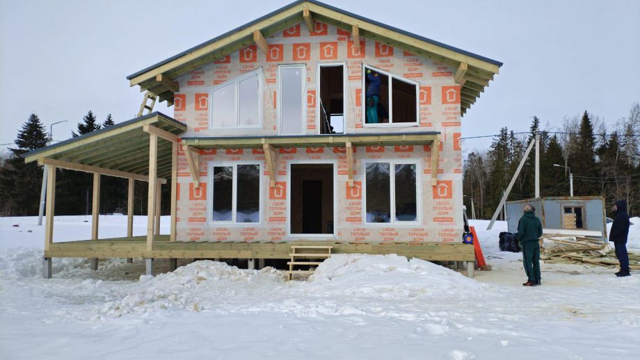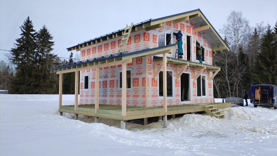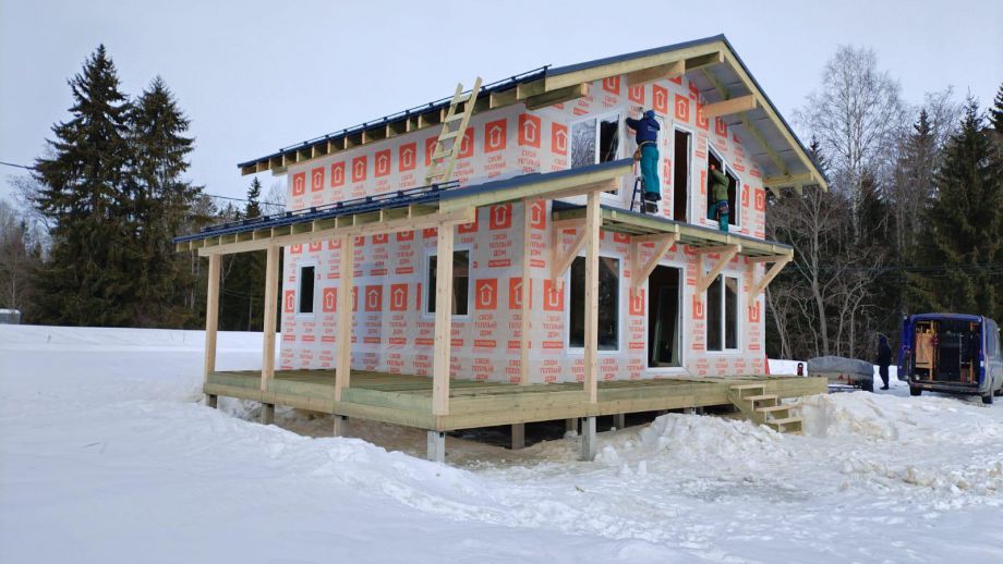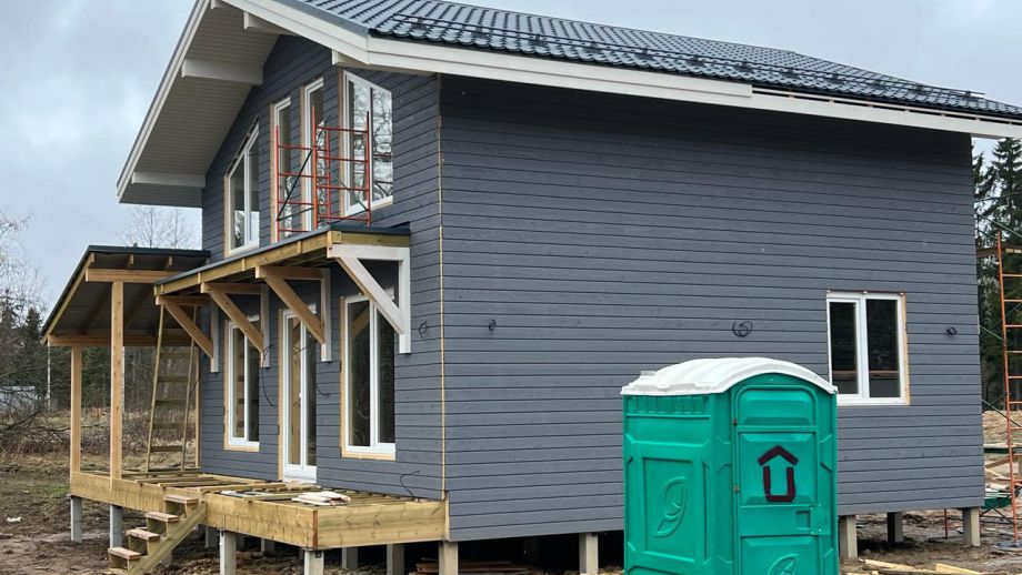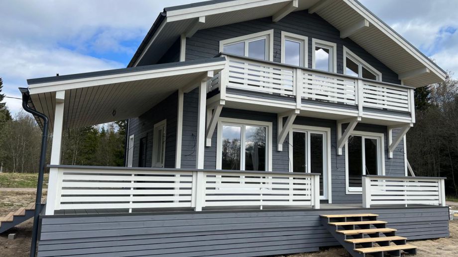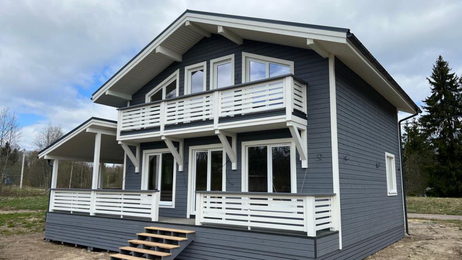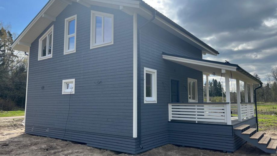 В указанную цену входит закрытый теплый контур с фасадом, окнами (Шуко), входной дверью, системами снегозадержания и водостока, террасой, балконом, перилами, крылечками, отделка цоколя, вентпакет УЛЬТРАВЕНТ, локальная очистная станция Аэробокс (с монтажом).