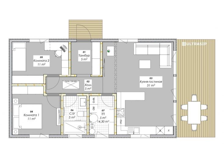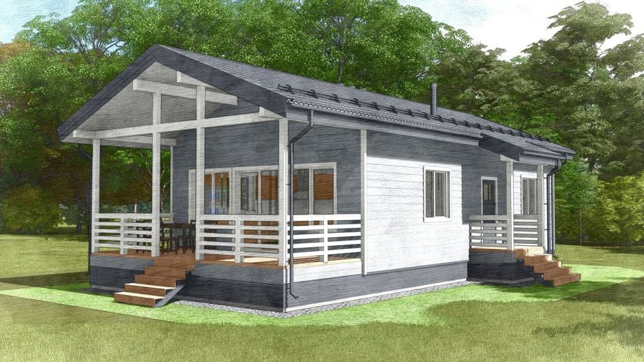 Небольшая площадь дома вследствие ограниченного бюджета - увы, частая ситуация сегодня. Однако, несмотря на это, в доме есть все, что нужно для комфортной жизни - потолки высотой 3м, кухня-гостиная площадью 31м2, приличная терраса, санузел, техпомещение и две жилых комнаты. Дом адаптирован под участок и пожелания заказчиков, учтены инсоляция, вид из окон, расположение заезда, наличие шумных соседей и трасс по соседству, и еще множество нюансов.