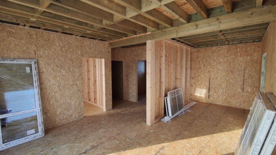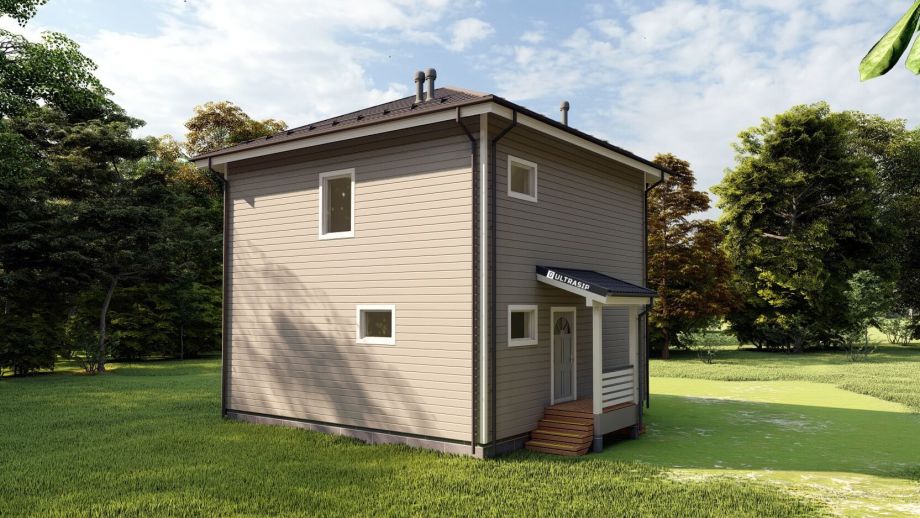 Несмотря на небольшие размеры, проектом предусмотрено четыре спальни, два санузла, гардеробная и достойная кухня-гостиная площадью 30м2. Террасу заказчики предпочли смонтировать позже самостоятельно.