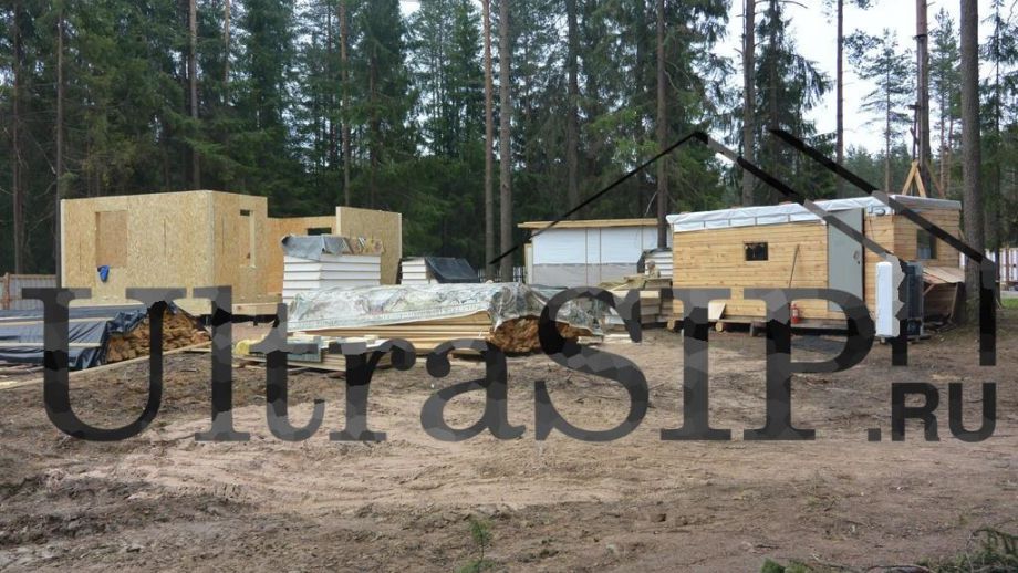 26 мая. Укрытый пиломатериал, сырой (на стропильную систему) и камерной сушки (в стены и перекрытие из СИП-панелей). В работе стены первого этажа.