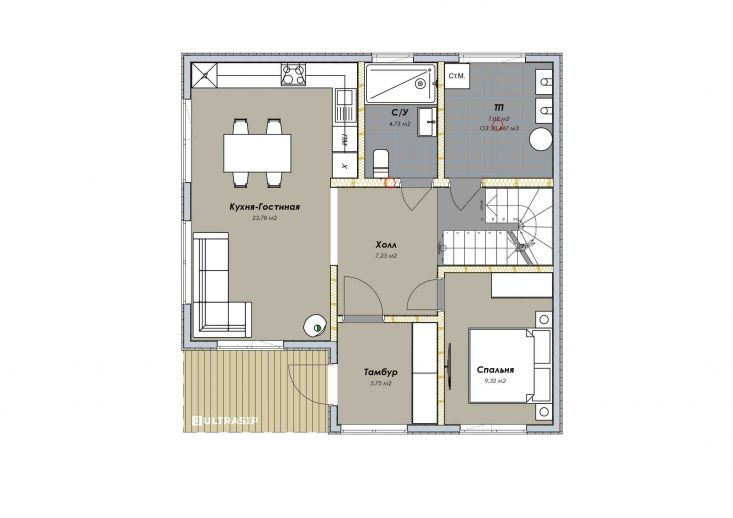 В указанную цену входит закрытый теплый контур с фасадом, окнами, входной дверью, системами снегозадержания и водостока, балконом, перилами, крыльцом и вентпакетом УЛЬТРАВЕНТ.