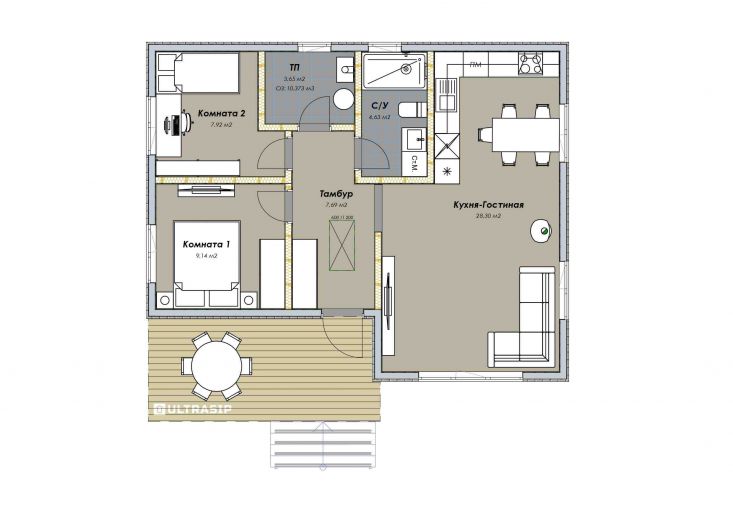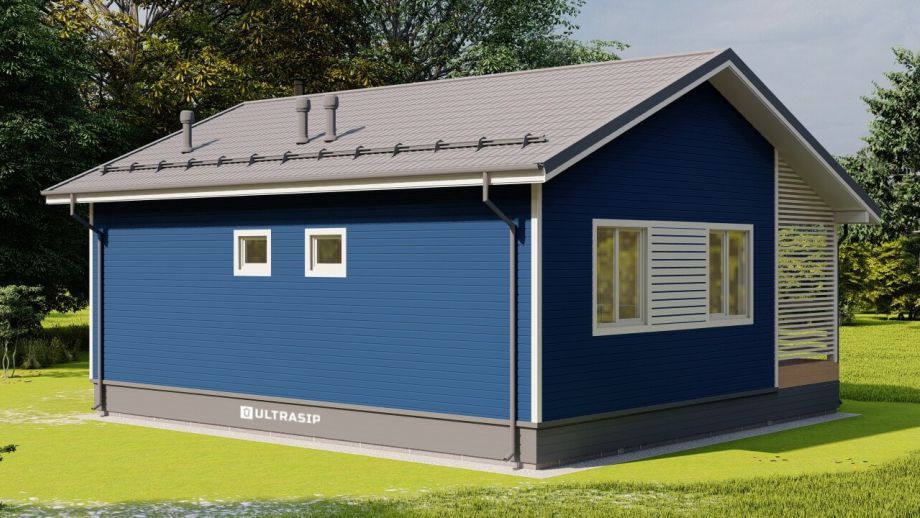 Небольшая площадь дома требует от архитектора повышенной отдачи - ведь надо "впихнуть невпихуемое". Считаем, мы справились, и в доме предусмотрено все, что нужно для комфортной жизни: кухня-гостиная площадью 29м2., удобная терраса/крыльцо, санузел, техпомещение и две жилых комнаты. Дом адаптирован под участок и пожелания заказчиков, учтены инсоляция, вид из окон, расположение заезда, наличие шумных соседей и трасс по соседству, и еще множество нюансов.