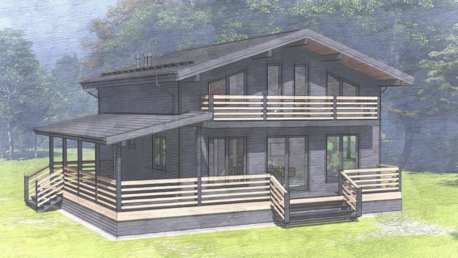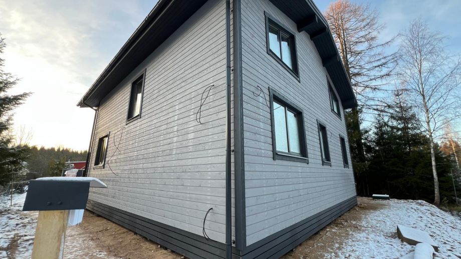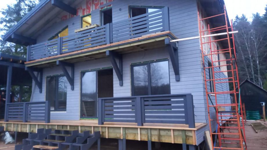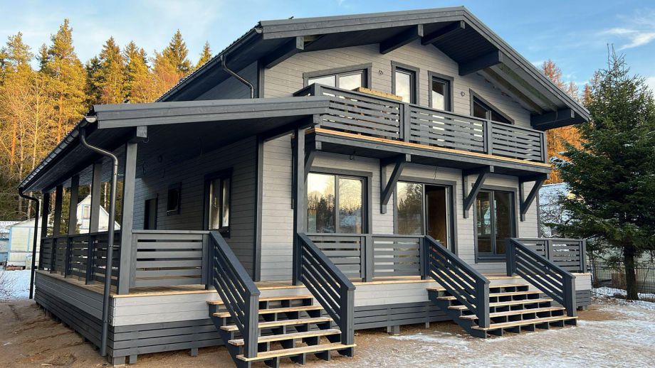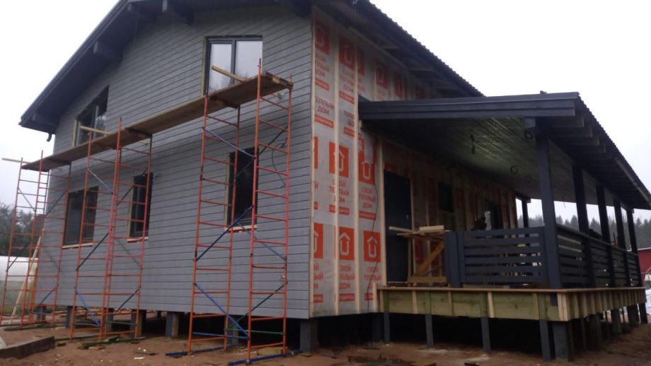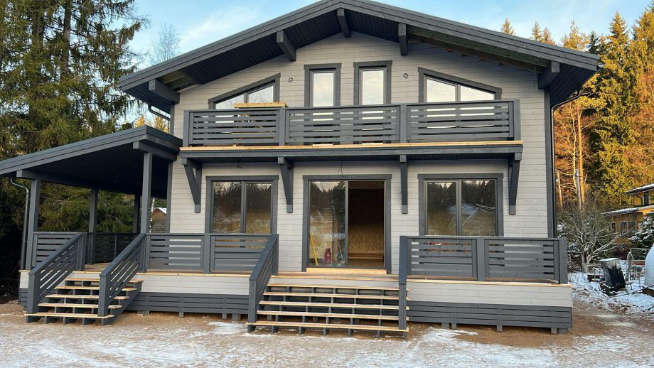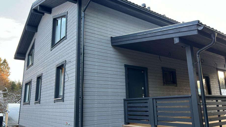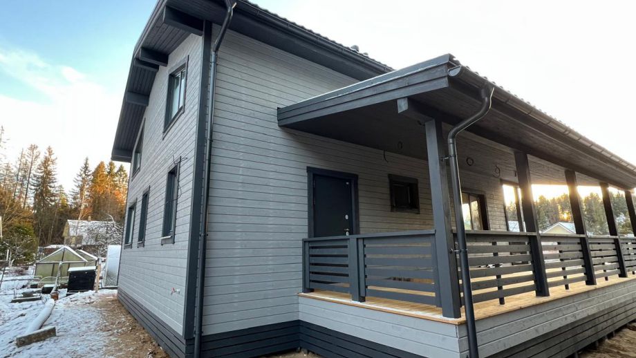 Дом построен в комплектации "закрытый теплый контур" - с фасадом, окнами, входной дверью, системами снегозадержания и водостока, террасой, балконом, перилами, крылечками, отделкой цоколя и вентпакетом УЛЬТРАВЕНТ.