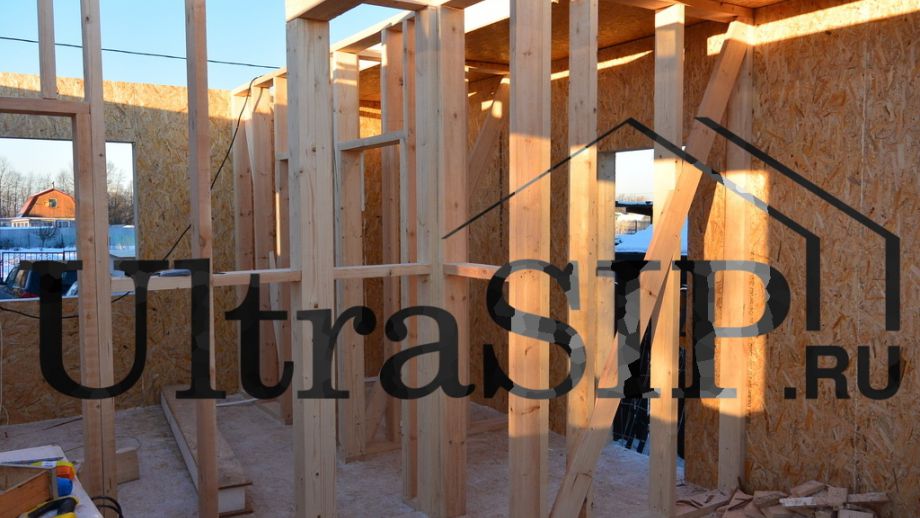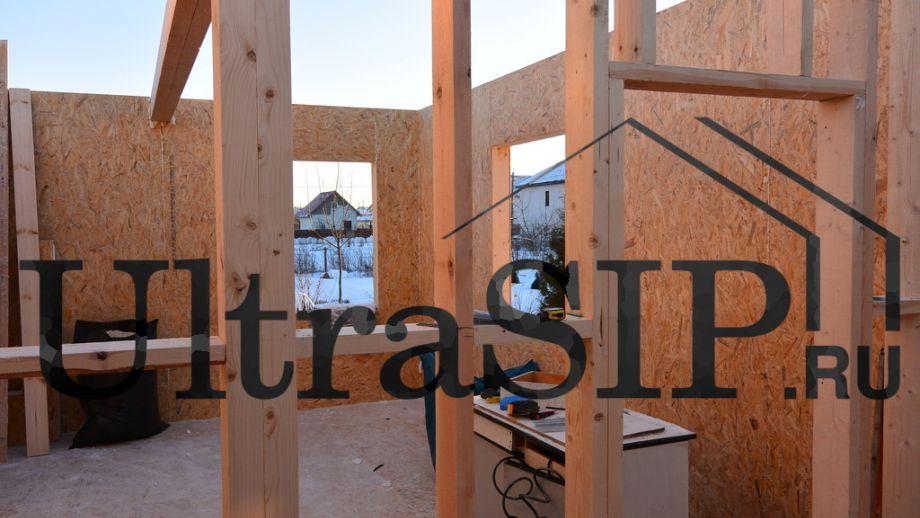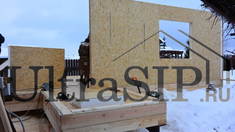 Один этаж, площадь 50 м². Фундамент на винтовых сваях. СИП панели: OSB-3 Калевала 12 мм, пенопласт завода "Новопласт" ПСБ -С25Ф высокой реальной плотности - от 16,7 кг/м3, клей ПУР производства BASF, Германия. Высота стен 2.8 м. холодный чердак, четырехвальмовая крыша с козырьком над тамбуром.