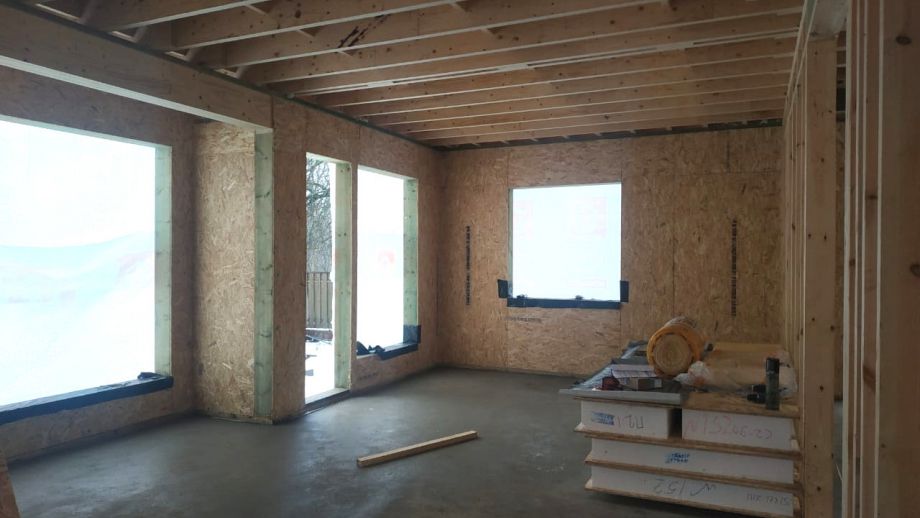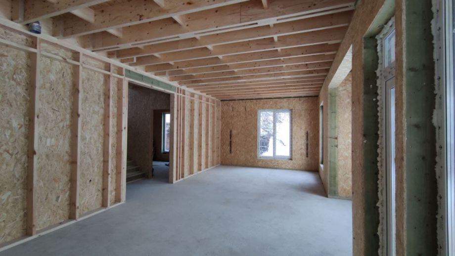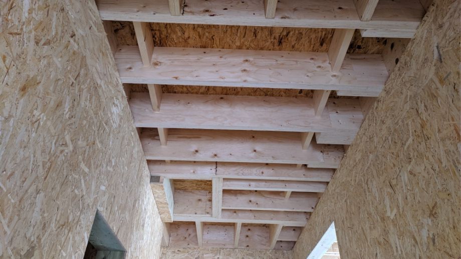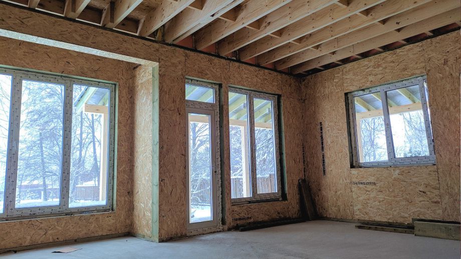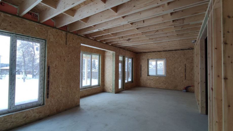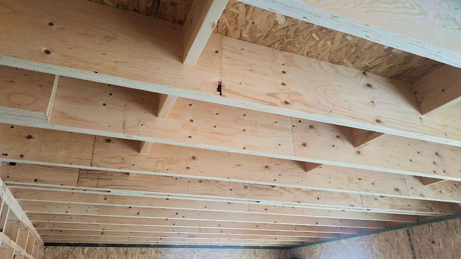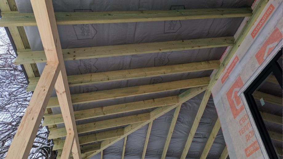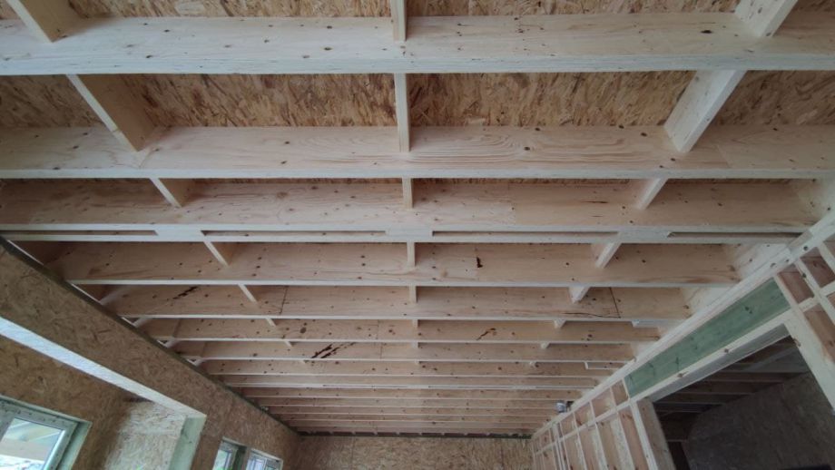 Увеличенный пролет над гостиной потребовал применения ЛВЛ-бруса сечением 51х300 в конструктиве межэтажного перекрытия, это тоже очень редко встречающийся вариант, правильный, прочный, но и более дорогой.