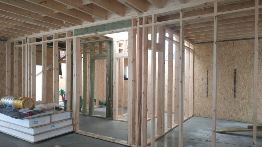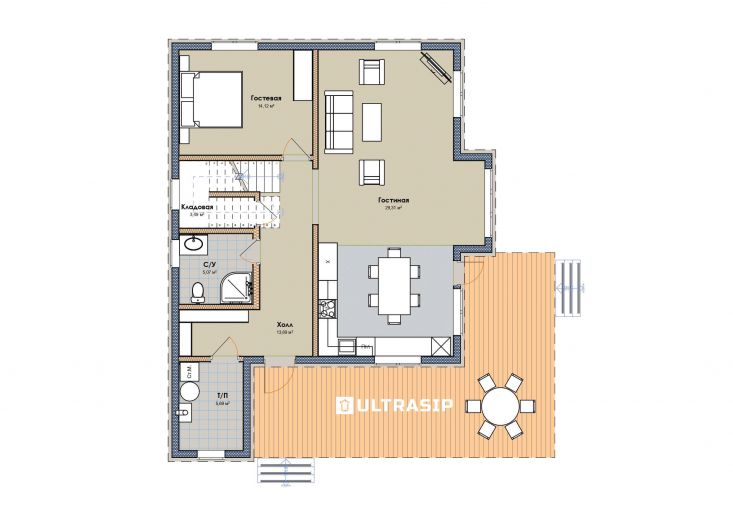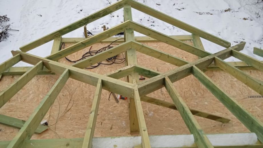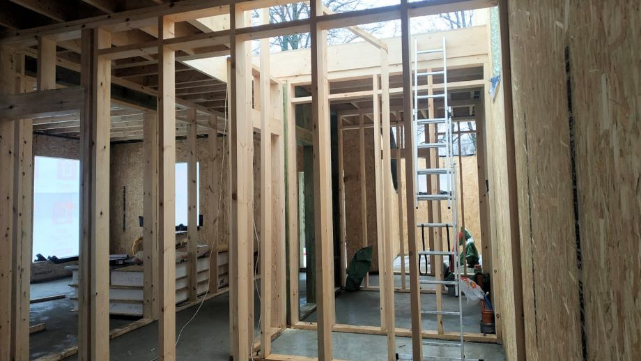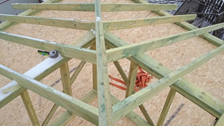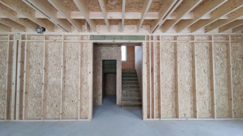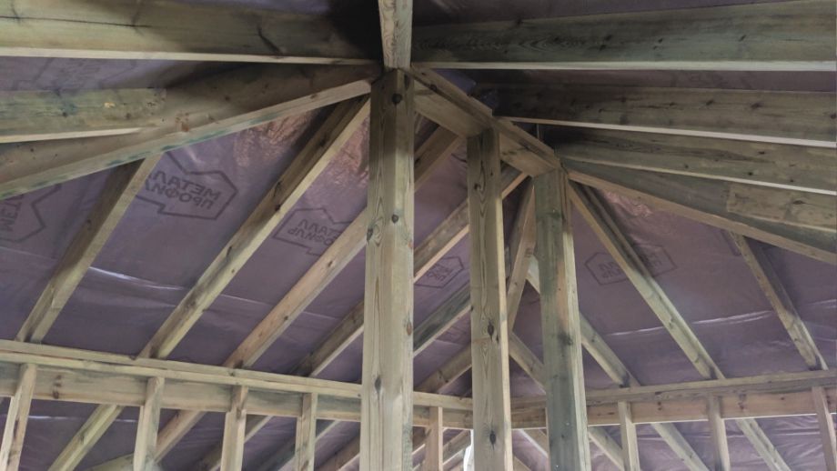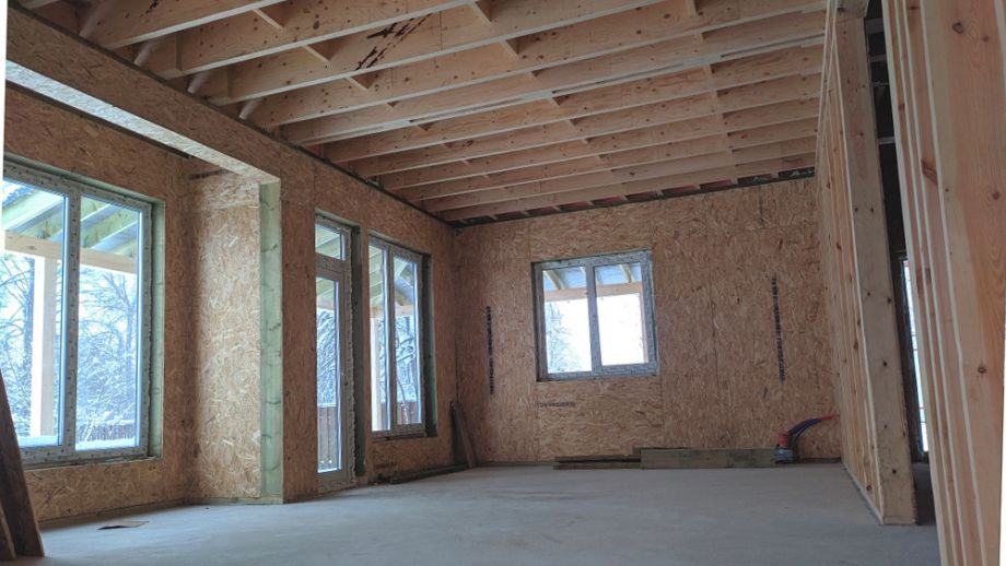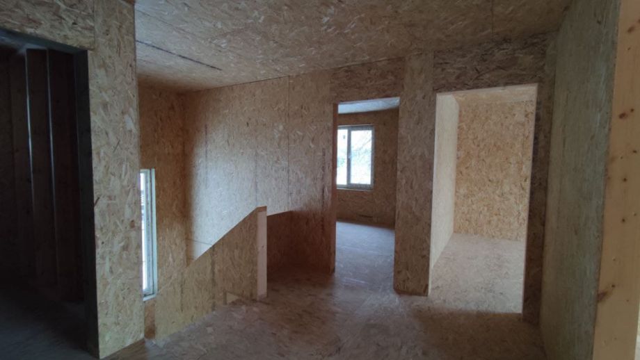 Увеличенный пролет над гостиной потребовал применения ЛВЛ-бруса сечением 51х300 в конструктиве межэтажного перекрытия, это тоже очень редко встречающийся вариант, правильный, прочный, но и более дорогой.