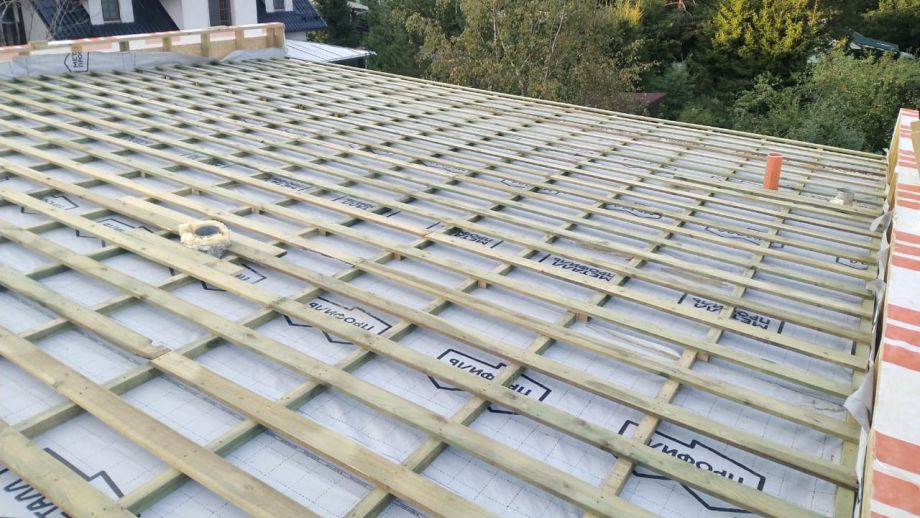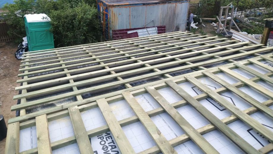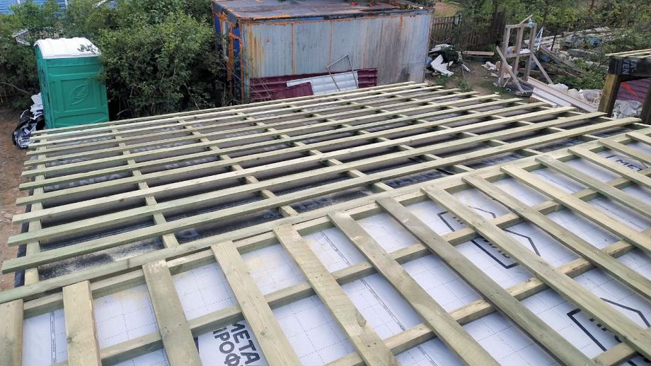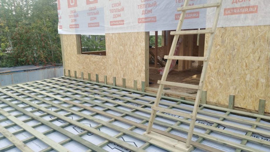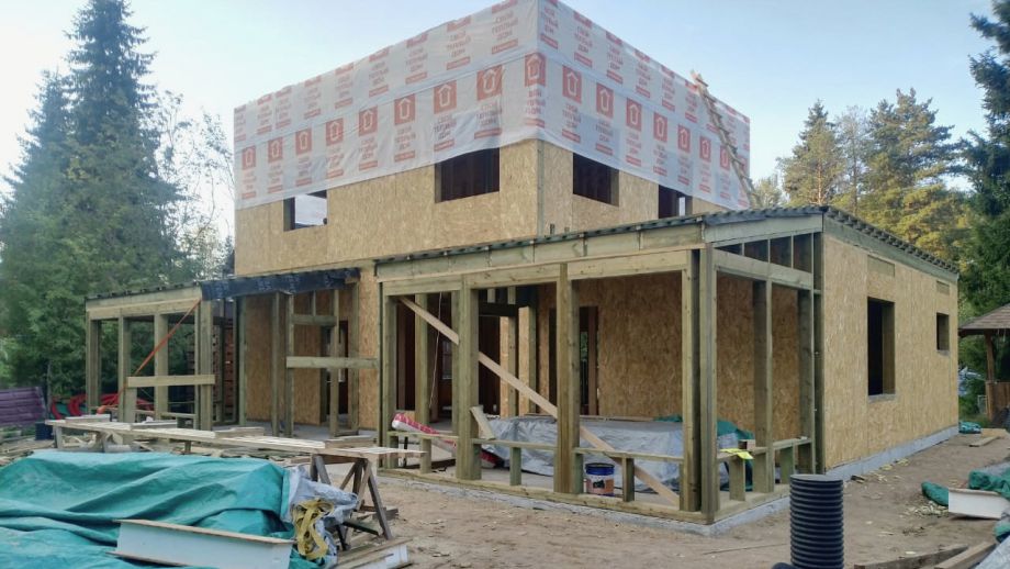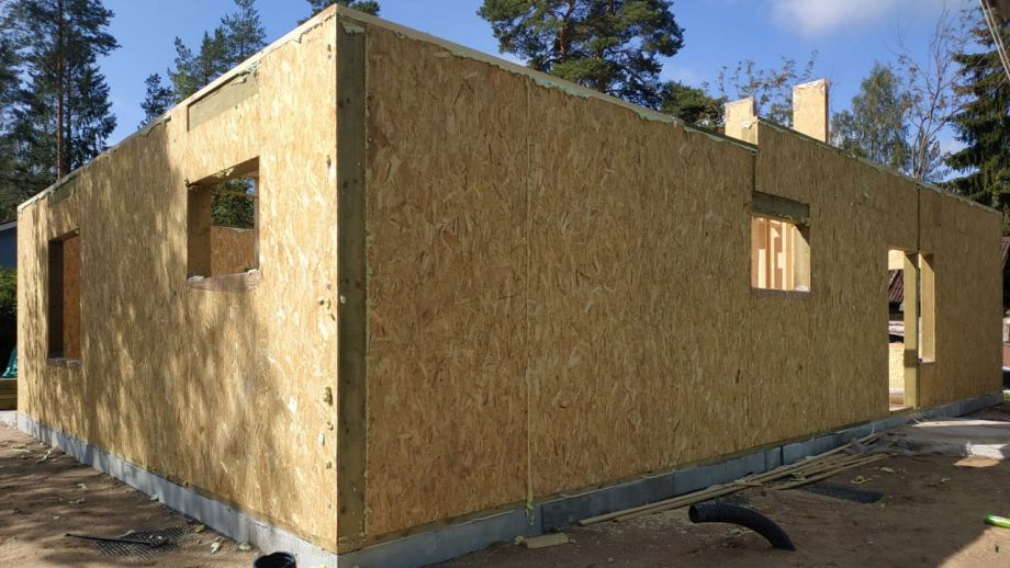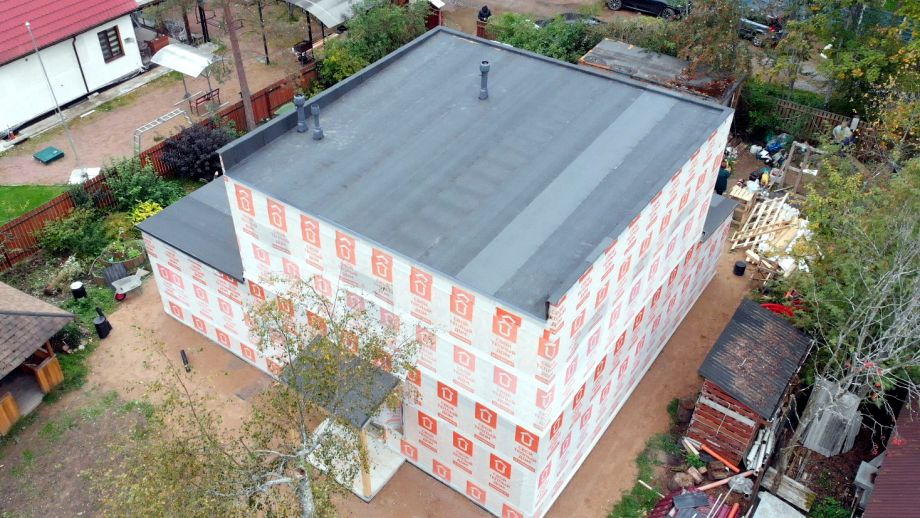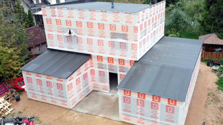 Кровля холодная односкатная, с парапетами и малым углом наклона. Фасад здесь будет из брашированной доски, сейчас ждем его готовности.